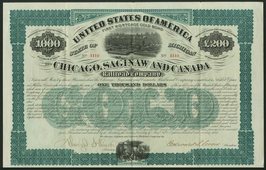 U.S.A.: Chicago, Saginaw and Canada Railroad Co., 7% first mortgage gold bond for $1000 or £200, 1873, #4110, logging scene at top, green and black, with coupons, NOT cancelled. GVF.
