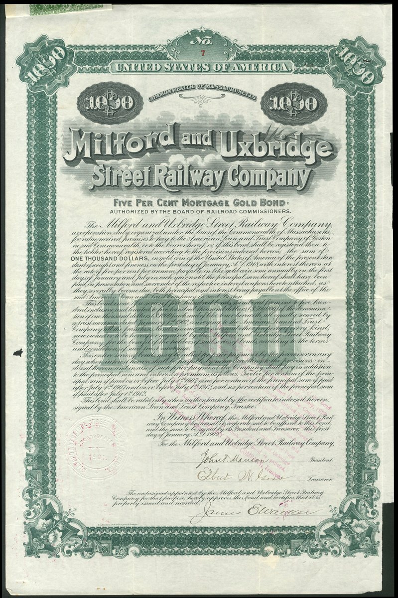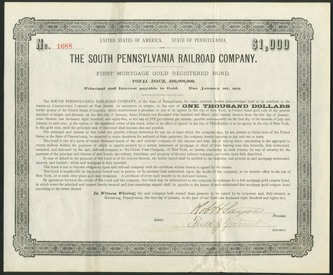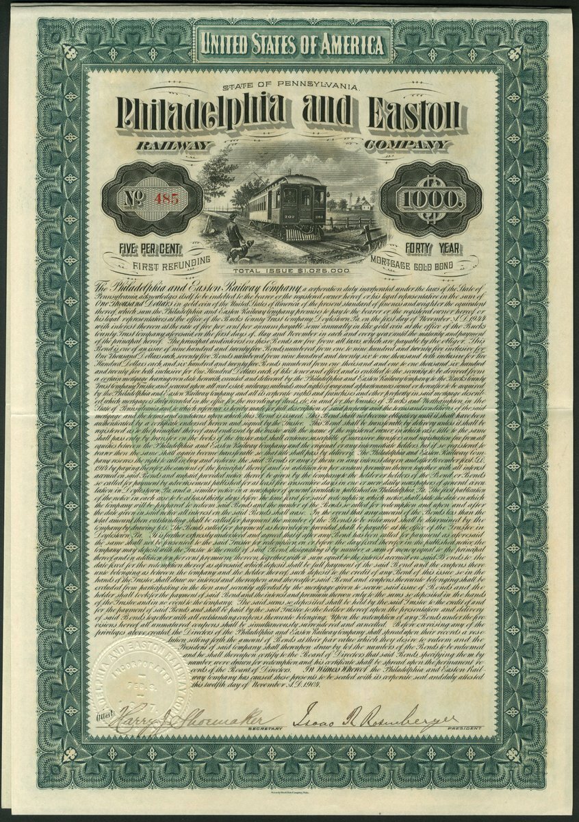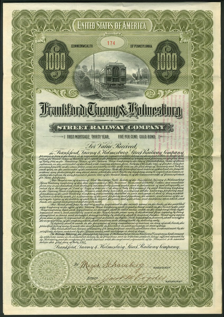 (x) U.S.A.: Frankford, Tacony & Holmesburg Street Railway Company, 5% First Mortgage Gold Bond, $1000, 1910, electric tram at top, green, with coupons. Together with other railroad bonds comprising Philadelphia and Easton Railway Co., $1000, 1904; Milford and Uxbridge Street Railway Co., $1000, 1903, and South Pennsylvania Railroad Company, $1000, 1885. VF and better (4).