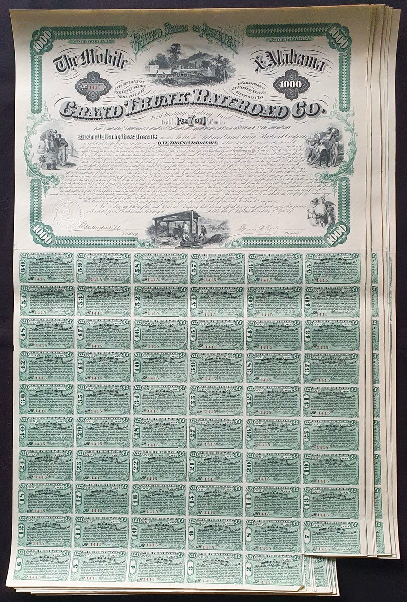U.S.A.: Mobile & Alabama Grand Trunk Railroad Co., 7% Loan, 1874, a group of 28 bonds for $1000, lovely piece with vignette of steam train at top, mining headgear at bottom, green and black, Continental Banknote Co., with coupons. All EF (28)