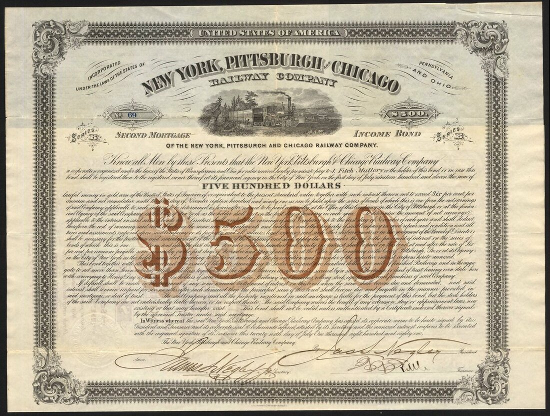U.S.A.: New York, Pittsburgh and Chicago Railway Company, Second Mortgage Income Bond, $500, 1881, #69, large format bond with steam train at top, ornate border, black with brown underprint '$500', with coupons, signed by James S. Negley as President. Negley was a Civil War General, a US Representative from Pennsylvania and a Railroad promoter. GVF.
