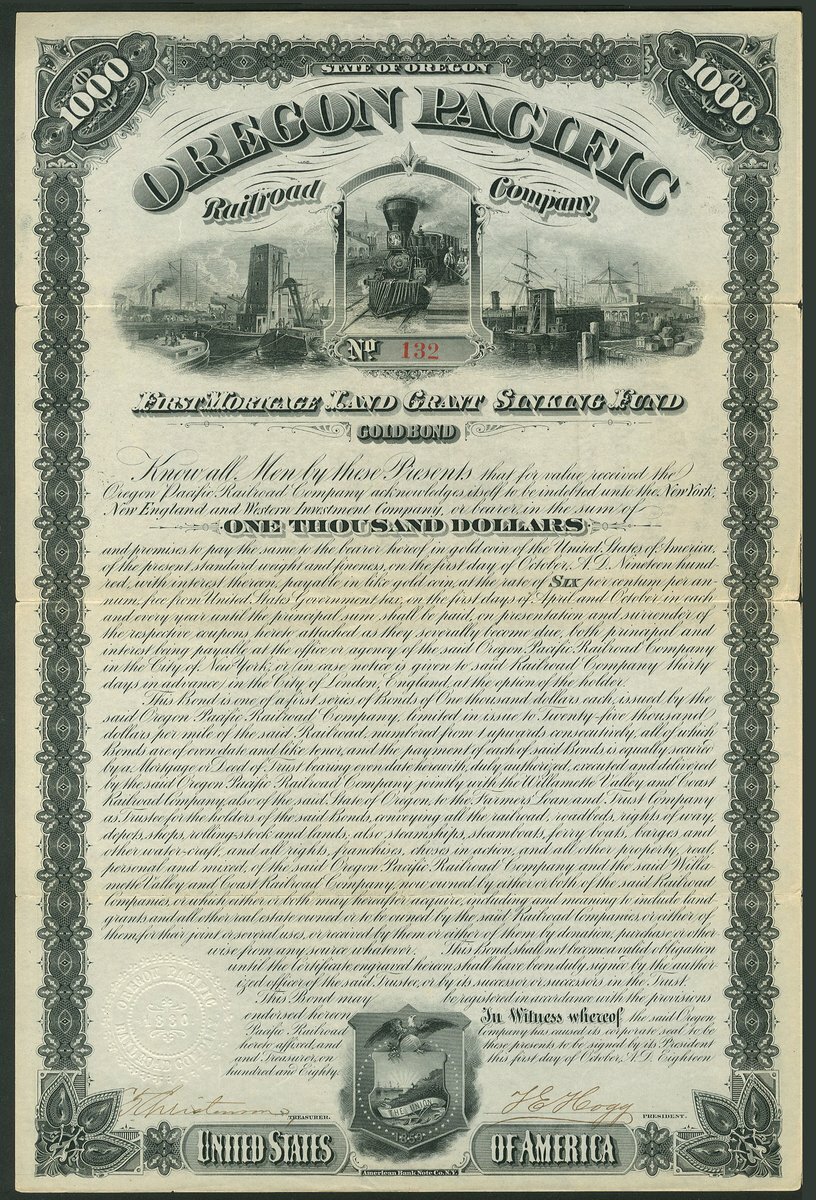 U.S.A.: Oregon Pacific Railroad Co. (OR), first mortgage land grant sinking fund Gold Bond for $1000, 1880, #132, signed by T.E.Hogg as President, front view of locomotive inset at top with dock scenes behind, ornate border, black, with coupons. Colonel Thomas Egerton Hogg was a rebel leader during the Civil War. He was sentenced to hang for attempting to rob ships coming into California whilst under the Confederate flag. It was commuted to life imprisonment but he was released under the general amnesty of 1866. In 1872 he reappeared in Corvallis and managed to incorporate and build the Corvallis & Yaquina Bay Railroad, later renamed the Oregon Pacific. The company failed due to mismanagement becoming bankrupt in 1890. Although Hogg was appointed receiver he was removed in 1893 and the line sold to the Oregon Central. Small edge tears to left where folded, otherwise VF.
