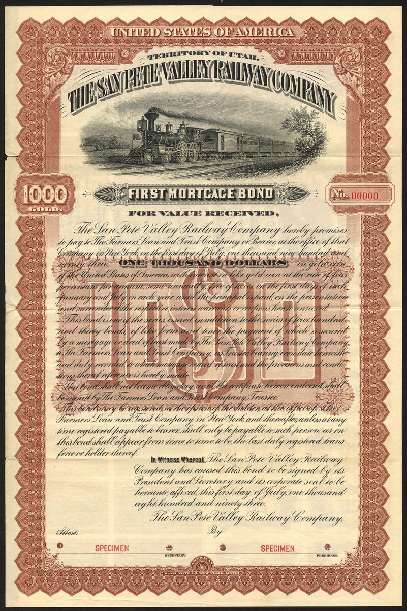 U.S.A.: San Pete Valley Railway Co. (UT), SPECIMEN first mortgage bond for $1000, 1893, printed by the American Bank Note Co., steam train at top, ornate border, brown and black. Small edge tear on fold to left side, VF.