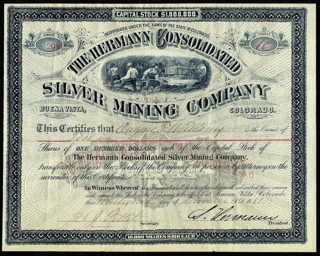 U.S.A.: Hermann Consolidated Silver Mining Company (CO), $100 shares, Buena Vista 18[81], #208, miners top centre, black, silver underprint. Mines at Buena Vista, Colorado. GVF.