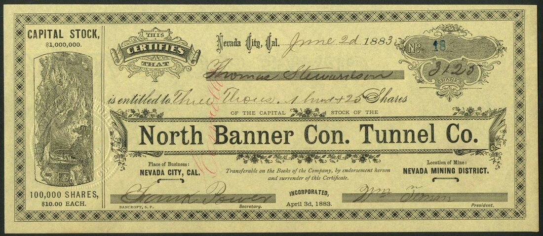 U.S.A.: North Banner Consolidated Tunnel Co., California, $10 shares, Nevada City 188[3], #18, typical California format piece with vignette of mine at left, black on yellow paper, cancelled. EF.