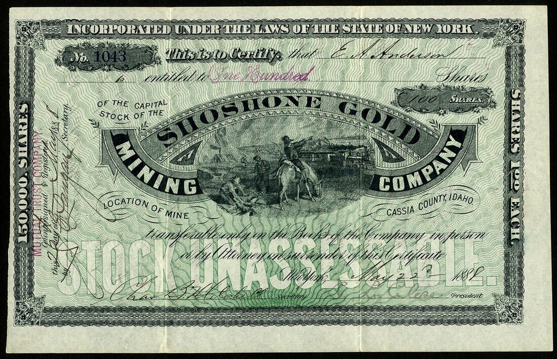 U.S.A.: Shoshone Gold Mining Company (NY), $1 shares, 188[8], #1043, cowboys on horseback watch train pass, black, green underprint. Mine in Cassia County, Idaho. GVF.