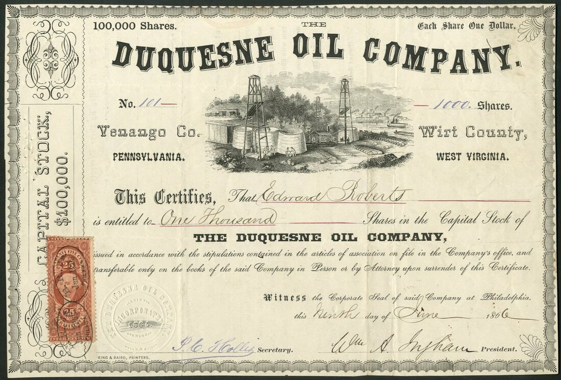 U.S.A.: Duquesne OIl Company (PA & WV), $1 shares, 186[6], 101, oil wells and storage tanks, black, adhesive revenue stamp. Cut close at edges, VF.
