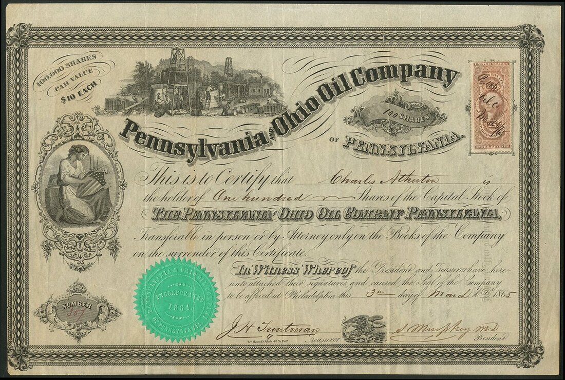 U.S.A.: Pennsylvania and Ohio Oil Company (PA), $10 shares, 186[5], #387, wells and storage tanks at top, black, green seal. VF.