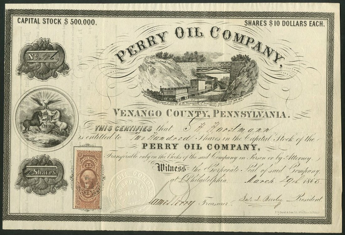 U.S.A.: Perry Oil Company (PA), $10 shares, 186[5], #506, steam train loaded with barrels of oil in centre, black, adhesive revenue stamp. VF.