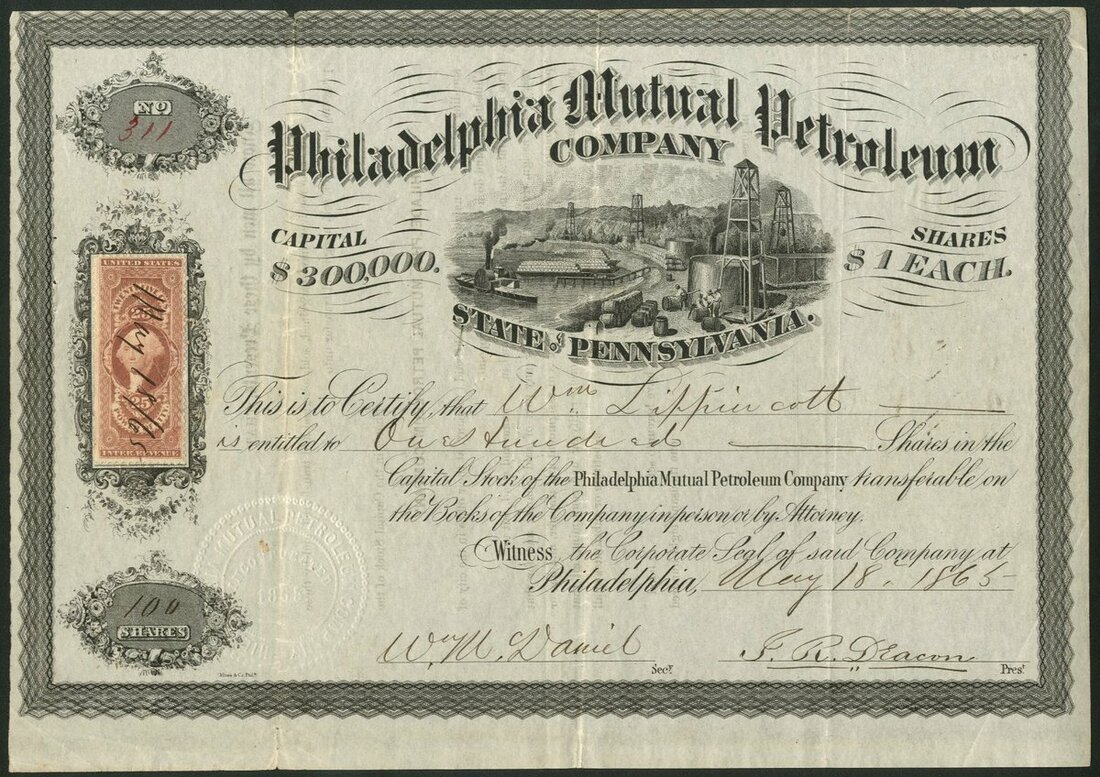 U.S.A.: Philadelphia Mutual Petroleum Company (PA), $1 shares, [1865], #311, busy vignette of oil wells, storage tanks, barges and paddle steamer, black, adhesive revenue stamp. Cut close at top edge, VF.