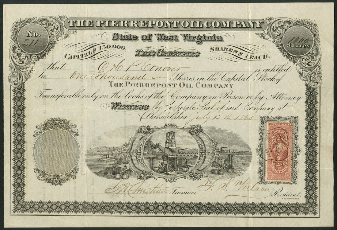 U.S.A.: Pierrepont Oil Company (WV), $1 shares, [1865], #211, oil well and storage tanks flanked by paddle steamer to left and steam train to right, black, adhesive revenue stamp. VF.