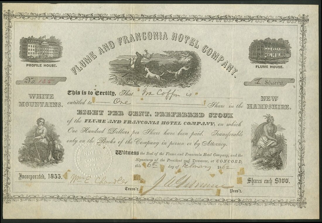 U.S.A.: Flume and Franconia Hotel Company (NH), $100 shares, Concord 18[62], #135, Flume House and Prospect House at each side with dogs attacking a stag in centre, black. Flume House Hotel was built in 1848 at the base of Mount Liberty and Profile House was opened in 1853. White Mountains, New Hampshire. Some light areas of paper adhesion, VF and scarce.