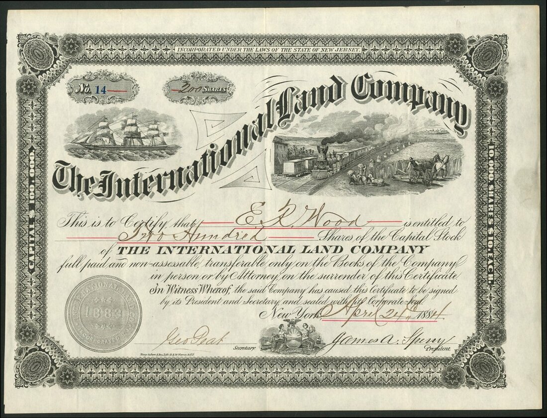 U.S.A.: International Land Company (NJ), $10 shares, New York 188[4], #14, steam train passing farm at right, steamship at left, black. GVF.