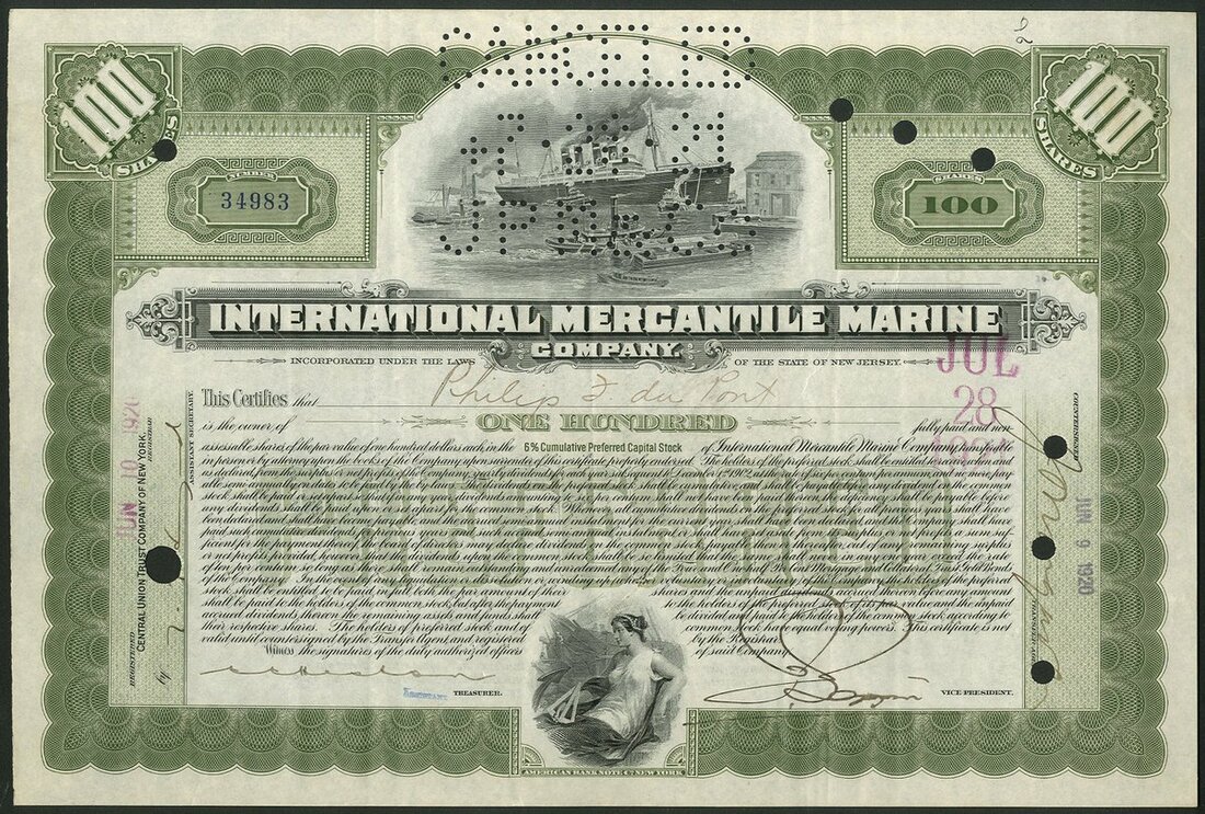 (x) U.S.A.: International Mercantile Marine Co., 100 preferred shares [1920], #34983, large steamship with smaller boats at top, ornate border, black and olive green, cancelled. Issued to Philip F du Pont and signed by him on reverse. The du Pont family was one of the richest in America having made its fortune in the gunpowder business, and later involved in the DuPont Co. and General Motors. AEF.