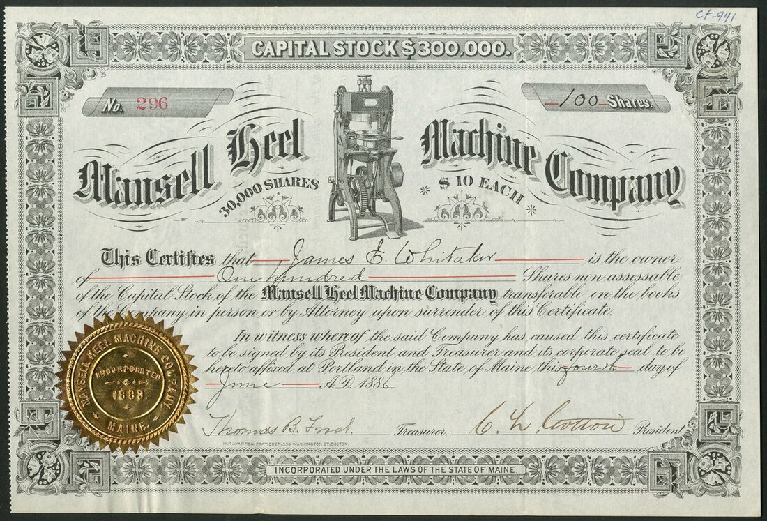 U.S.A.: Mansell Heel Machine Company, ME, $10 shares, Portland 188[6], #296, vignette of machine for making shoe heels at top, black, gold seal, printed by Warren in Boston. GVF.