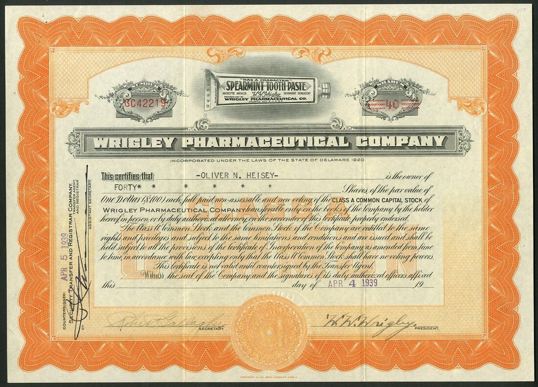 U.S.A.: Wrigley Pharmaceutical Company (DE), pair of certificates, common shares, 19[24], #2360 and Class A, common shares, 19[39], #GC42219, both signed by W. W. Wrigley as President, with tube of toothpaste at top, orange and black. Wrigley formed this company capitalising on the success of the Wrigley Spearmint Chewing Gum to which he had no connection. His advertising and stock selling schemes were dubious and he was sued by the real Wrigley in 1929. This however failed to stop Wrigley Pharmaceutical which went on until 1941, famously taking a large stand at the 1939 New York World's Fair. VF (2).