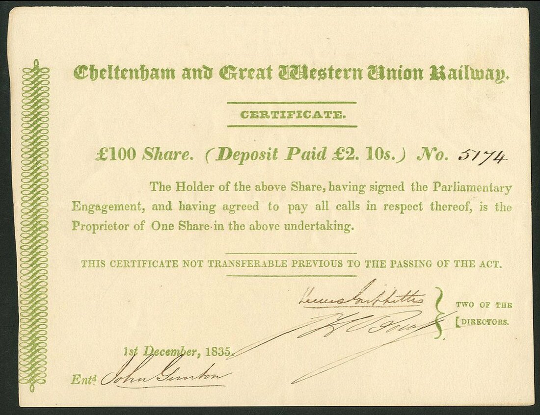 Great Britain: Cheltenham and Great Western Union Railway, scrip certificate for £100 share, 1835, #5174, scrollwork at left, small format, green. Centre fold otherwise EF.