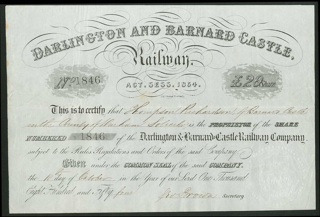 Great Britain: Darlington and Barnard Castle Railway, £20 share, 185[4], #1846, black, embossed seal. Incorporated on 3rd July 1854. A 15¼ mile line between the towns also connecting with the Stockton and Darlington Railway. It opened in 1856, and became amalgamated (along with others) with the Stockton & Darlington Railway who issued preferential stock in lieu of existing shares, to pay all debts. VF.