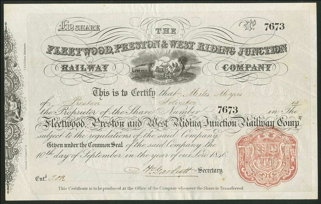 Great Britain: Fleetwood, Preston & West Riding Junction Railway Company, £12 share, 1846, #7673, arms in centre, black, greyish underprint, attractive red embossed seal. Very minor foxing, VF.