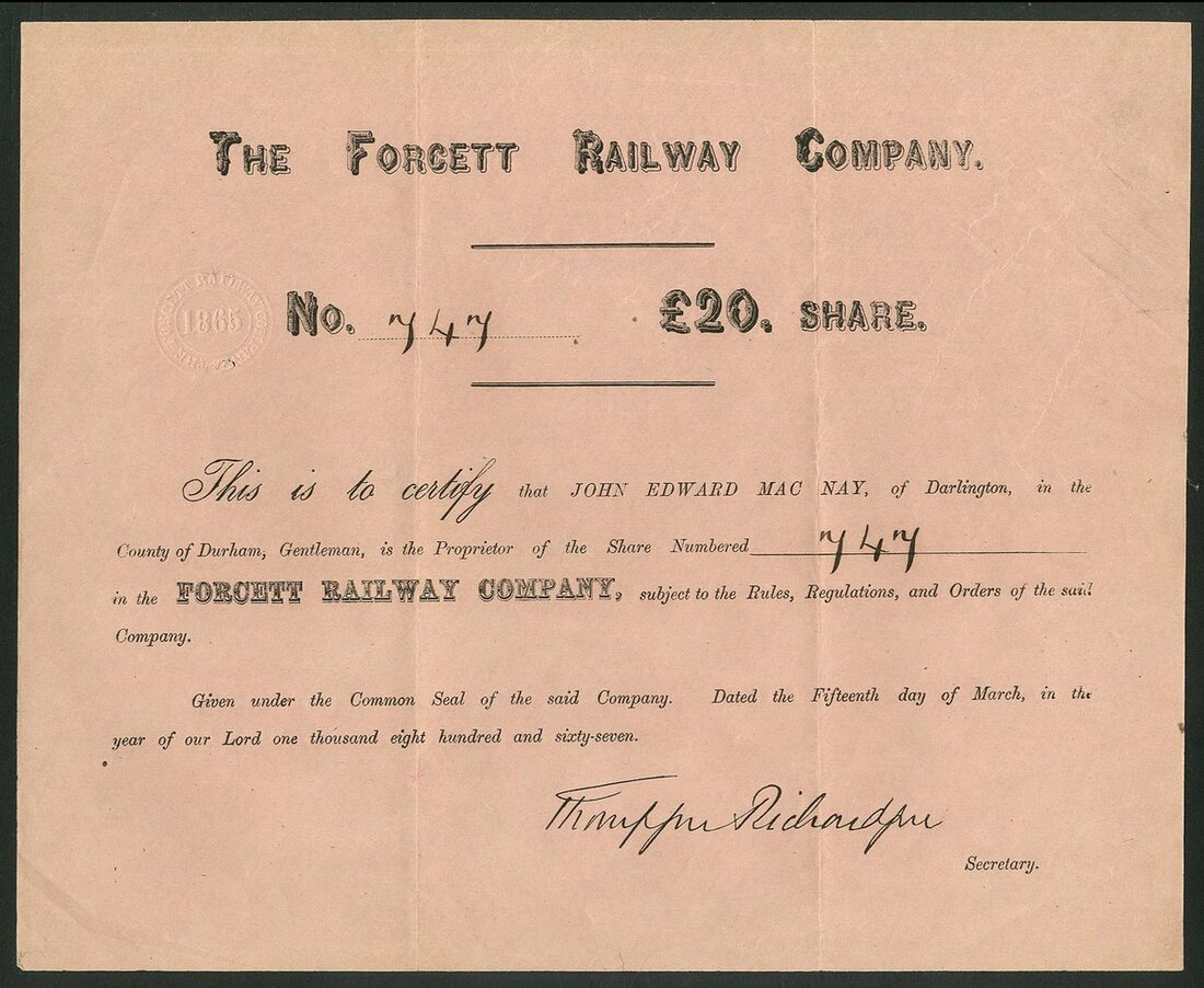 Great Britain: Forcett Railway Company, £20 share, 1867, #747, black on orangish paper. A small line opened in 1866 linking Forcett and East Layton Quarries to the Darlington & Barnard Castle Railway. GVF.