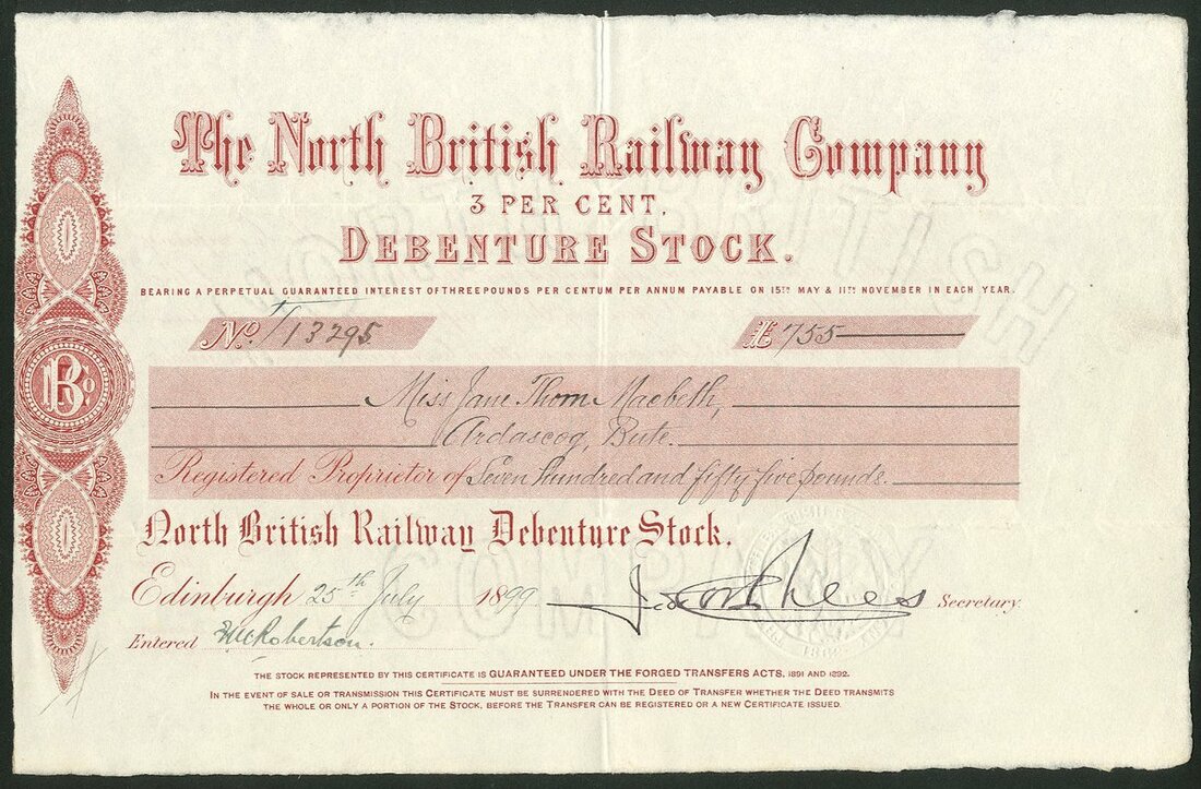 Great Britain: North British Railway Company, 3% Debenture Stock, £[755], 18[99], #13295, scrollwork at left, red on attractive watermarked paper. GVF and rare.