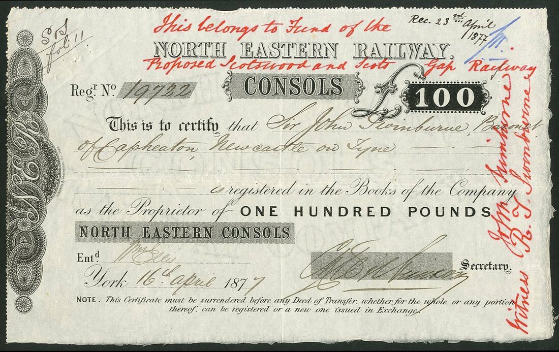 Great Britain: North Eastern Railway, Consols, £100, 187[7], #19722, scrollwork at left, black. Ink endorsements, GVF and scarce.