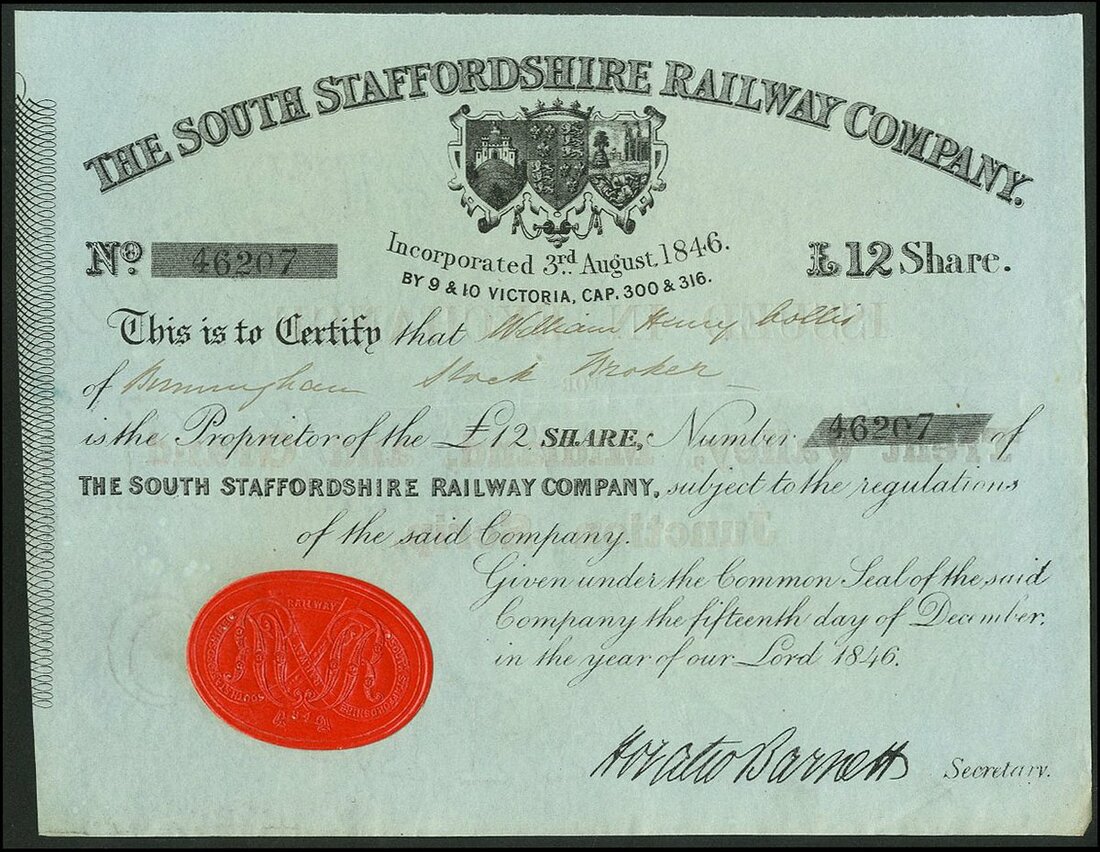 Great Britain: South Staffordshire Railway Company, £12 share, 1846, #46207, 3 coats of arms at top, black on green paper, red seal. EF.