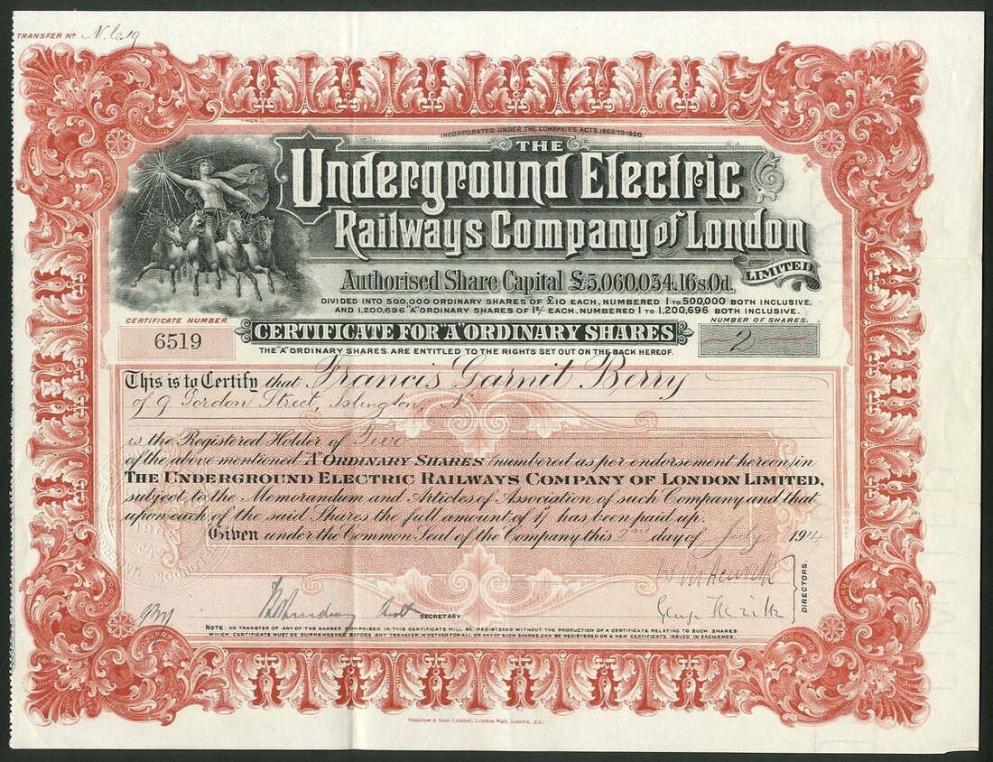 Great Britain: Underground Electric Railways Company of London, 'A' Ordinary shares, 19[14], #6519, allegory on quadriga top left, ornate border, red, printed by Waterlow & Sons, with several related documents. The precursor of the present underground railway system it was originally formed in 1902 as the holding company for the Baker Street & Waterloo Railway, Charing Cross, Euston and Hampstead Railway and the Great Northern, Piccadilly and Brompton Railway. Later incorporated the District Railway. GVF and a rare type only previously seen as a specimen.