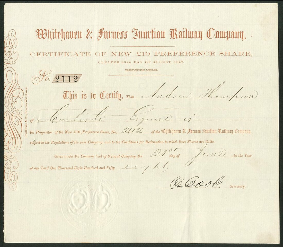 Great Britain: Whitehaven & Furness Junction Railway Co., New £10 preference share, 185[8], #2112, orange-brown. Incorporated in 1845 to build a line from Whitehaven to Ravenglass and onwards to join the Furness Railway at Foxfield. Near EF.