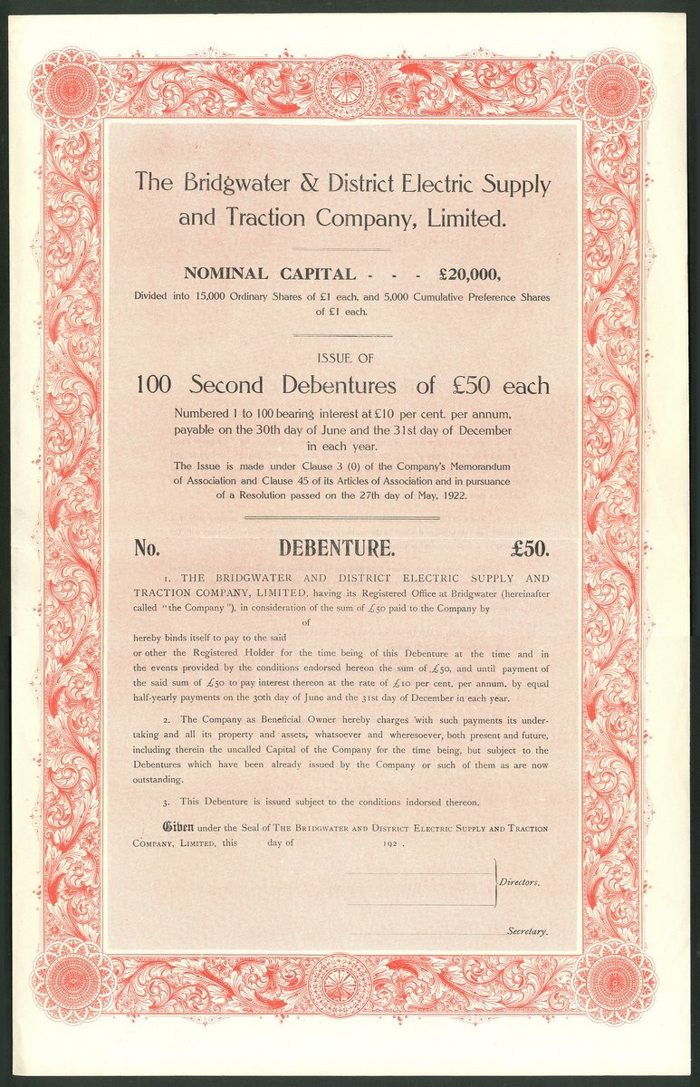 Great Britain: Bridgwater & District Electric Supply and Traction Co. Ltd., £50 second debenture, printed by Waterlow & Sons, un-issued, 192-, not numbered, large format, ornate border, red. Authorised in 1903 to supply electricity to Bridgwater, Durleigh and Wembdon. AEF.