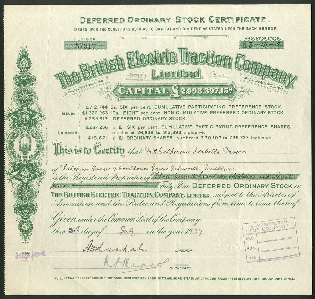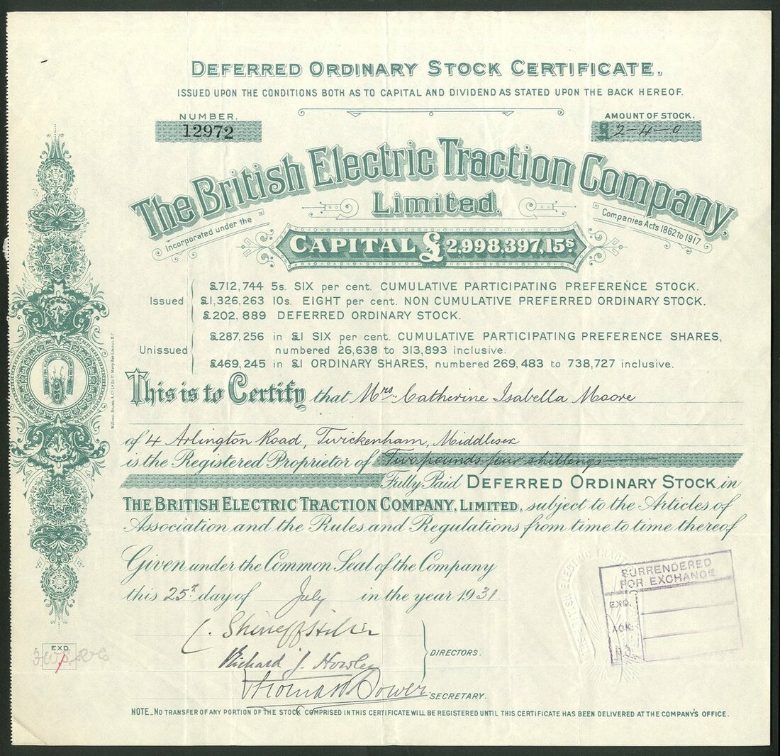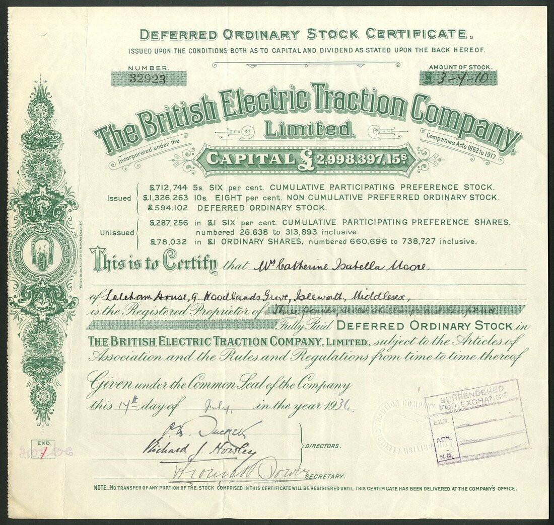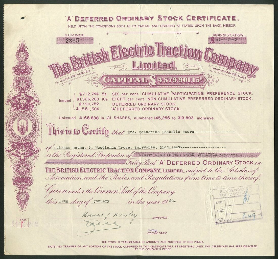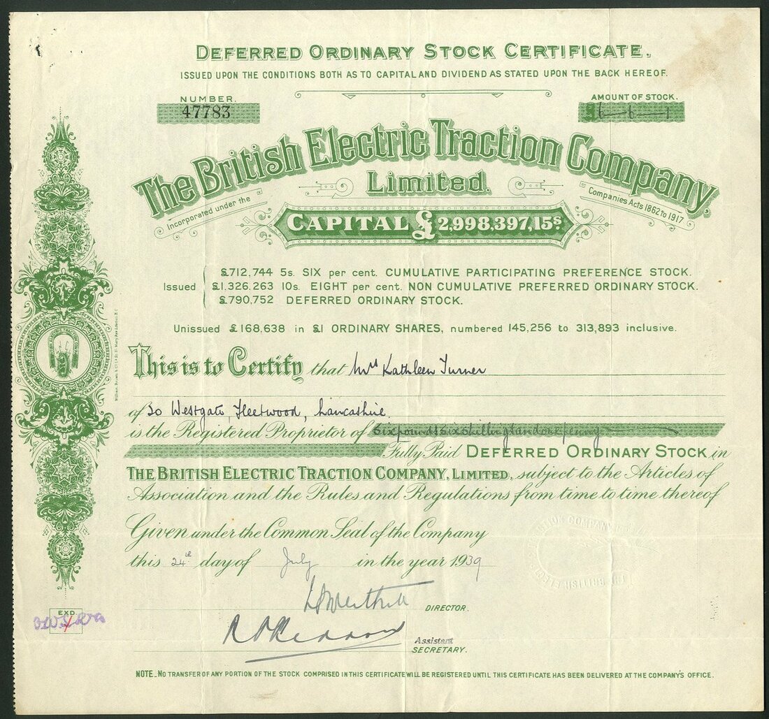 Great Britain: British Electric Traction Company Limited, a group of certificates, all different, comprising Deferred Ordinary Stock certificates, 19[31], 19[33], 19[34], 19[35], 19[36], 19[37], 19[38] and 19[39], all with different capital printing at top, green; 8% Non Cumulative Preferred Ordinary stock, 19[48], #15984, blue, and 'A' Deferred Ordinary stock, 19[50], #2863, mauve, all cancelled. See images for varieties. Originally formed in 1895 to aid in the electrification of tramways in the United Kingdom. It became the largest operator of electric trams. Diversified over the years into Motor buses. Developed into a conglomerate of misellaneous companies in transport, entertainment and construction. Generally VF (10).