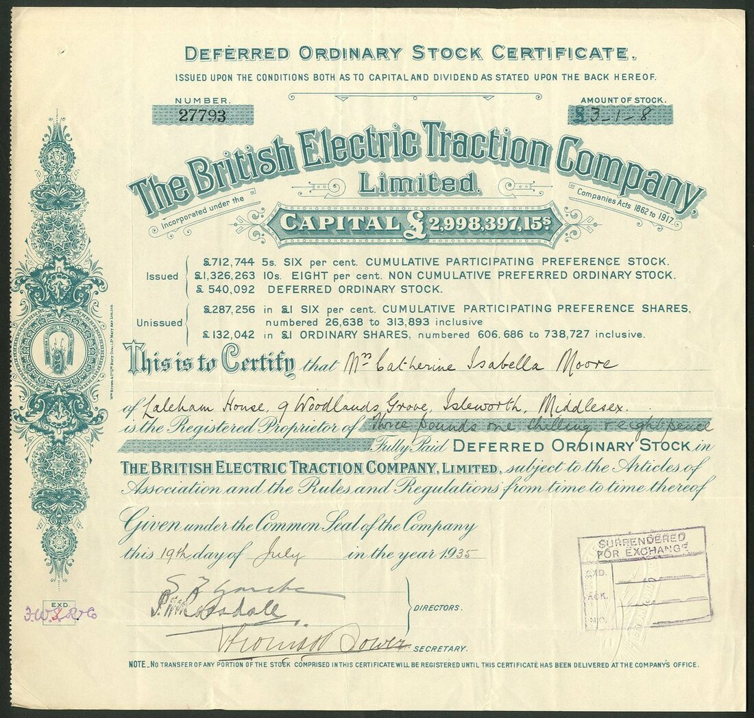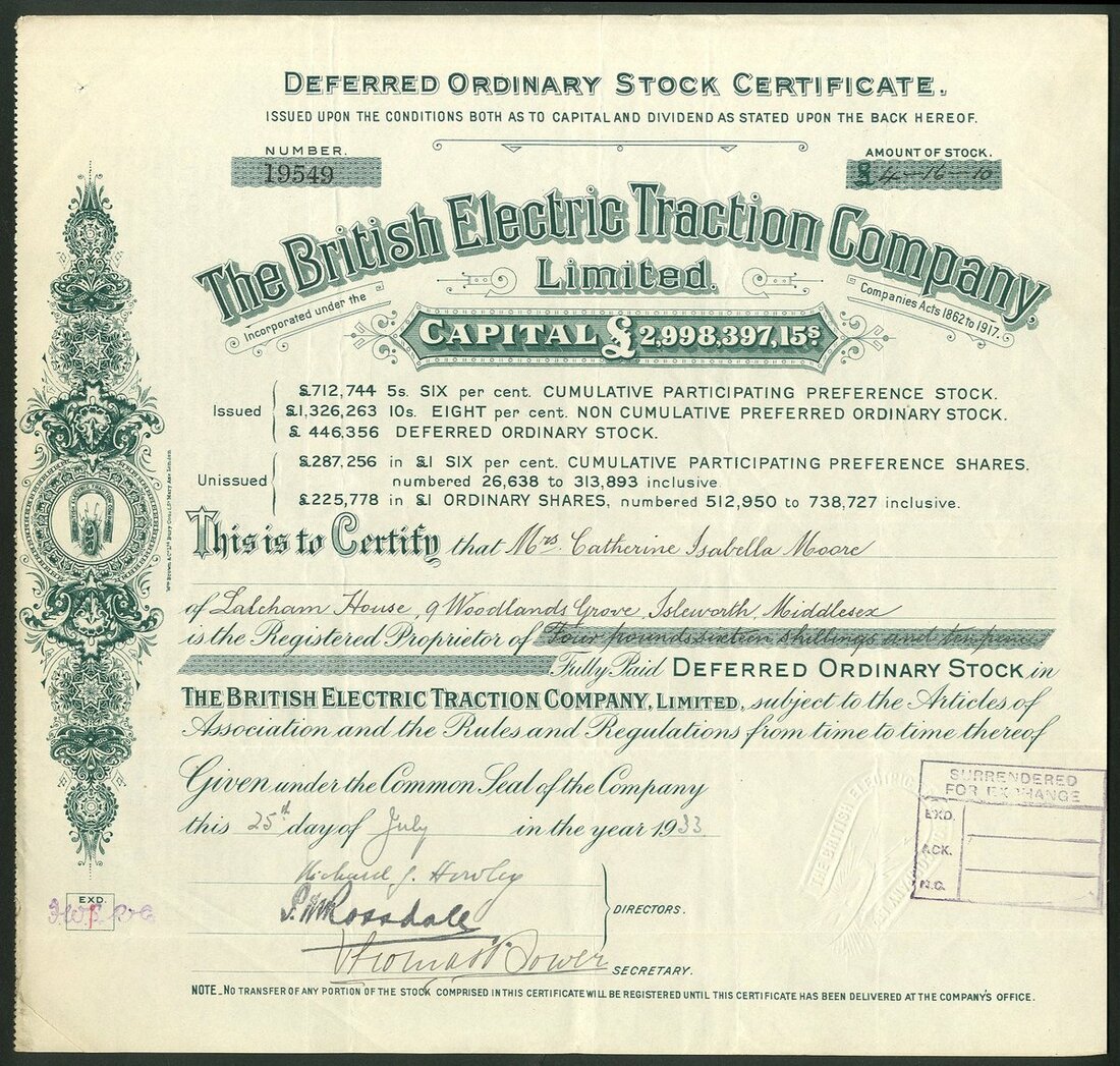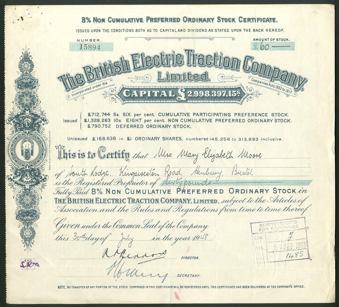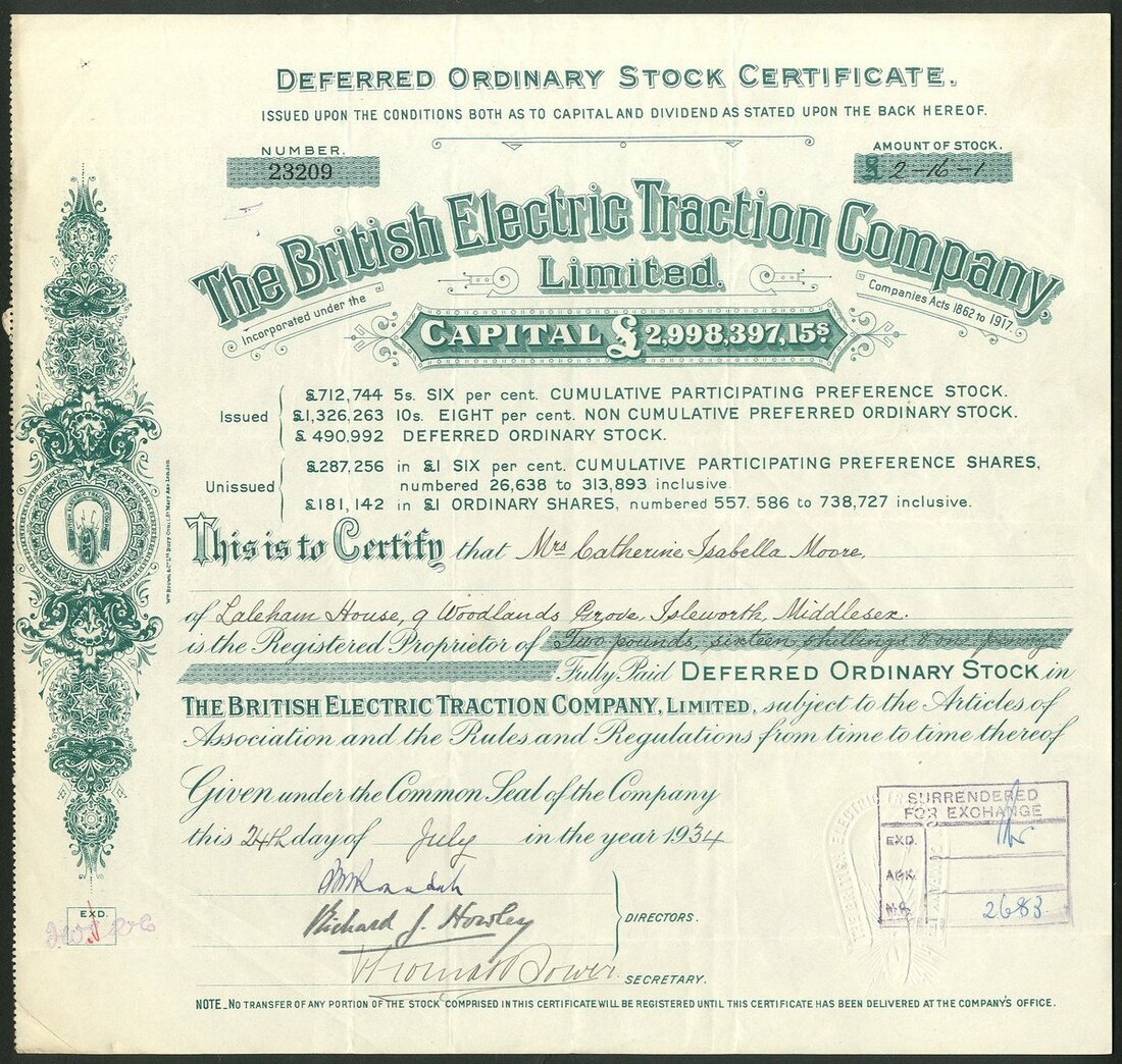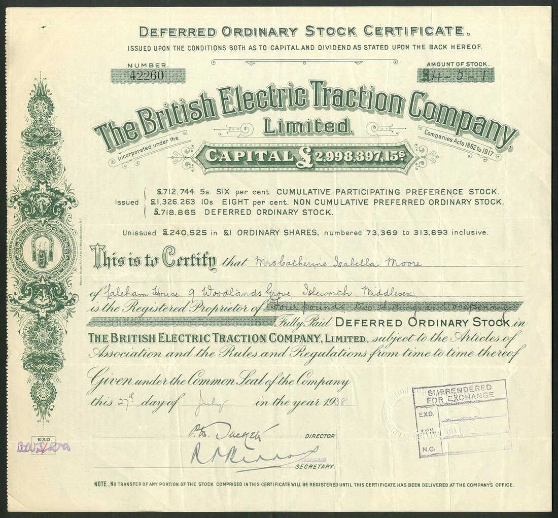Great Britain: British Electric Traction Company Limited, a group of certificates, all different, comprising Deferred Ordinary Stock certificates, 19[31], 19[33], 19[34], 19[35], 19[36], 19[37], 19[38] and 19[39], all with different capital printing at top, green; 8% Non Cumulative Preferred Ordinary stock, 19[48], #15984, blue, and 'A' Deferred Ordinary stock, 19[50], #2863, mauve, all cancelled. See images for varieties. Originally formed in 1895 to aid in the electrification of tramways in the United Kingdom. It became the largest operator of electric trams. Diversified over the years into Motor buses. Developed into a conglomerate of misellaneous companies in transport, entertainment and construction. Generally VF (10).