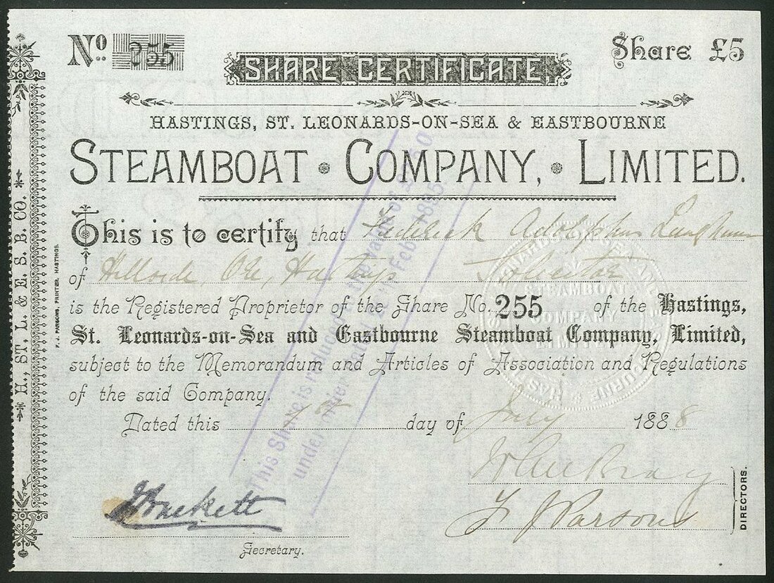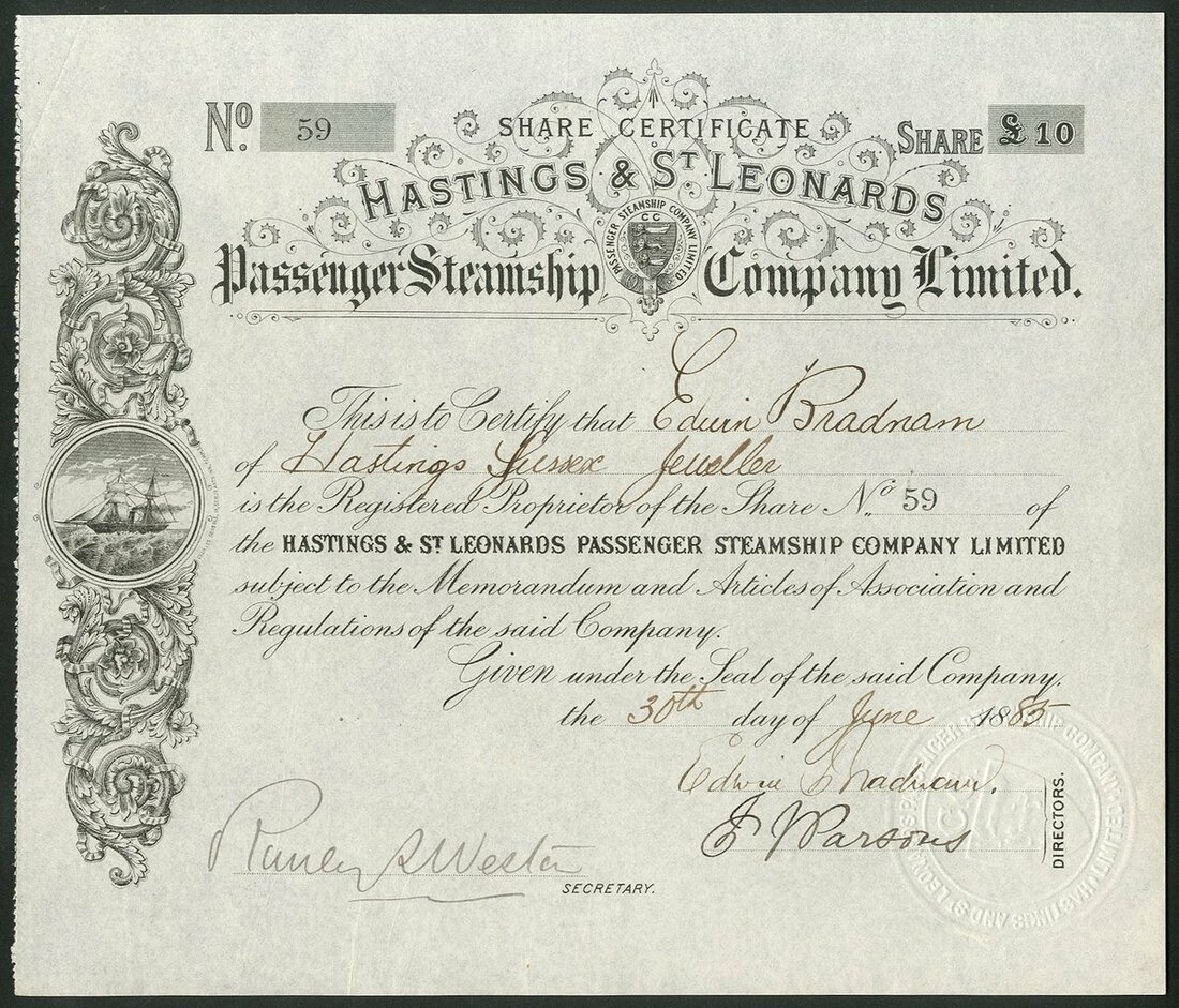 Great Britain: Hastings & St.Leonards Passenger Steamship Co. Ltd., £10 share, 18[85], #59, vignette of sail assisted steamship in scrollwork at left, black, embossed seal; together with Hastings, St.Leonards-On-Sea & Eastbourne Steamboat Co. Ltd., £5 share, 188[8], #255, black, embossed seal. Both EF (2).
