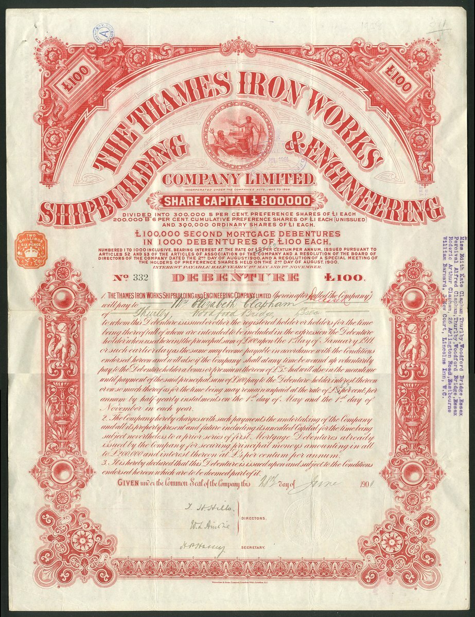 Great Britain: Thames Iron Works Shipbuilding & Engineering Co. Ltd., a group of 4 x 2nd mortgage debentures for £100, 190[1], #332 - #335, very ornate border, vignette within title of allegorical figures with ships behind, red, printed by Waterlow & Sons. Founded in 1859, the largest shipbuilder on the Thames. It had the distinction of building the first all iron warship in 1860. In the 1880's a football club was started for its employees which by 1900 was wound up and West Ham United was created. In 1905 the motor department was developed to produce steam wagons and in 1906 a petrol car was launched. Closed in 1912. GVF (5).