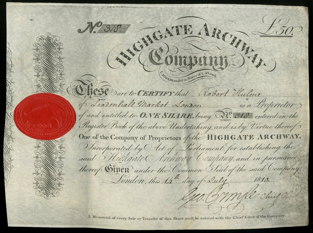 Great Britain: Highgate Archway Company, £50 share, London 18[10], #318, attractive black printing, on vellum, red wax paper seal at left. Formed to cut a tunnel through the steep hill at Highgate, North London, which collapsed when almost complete, forming the present cutting. The company then built the bridge across, which was rebuilt at the turn of the century. GVF [R8].