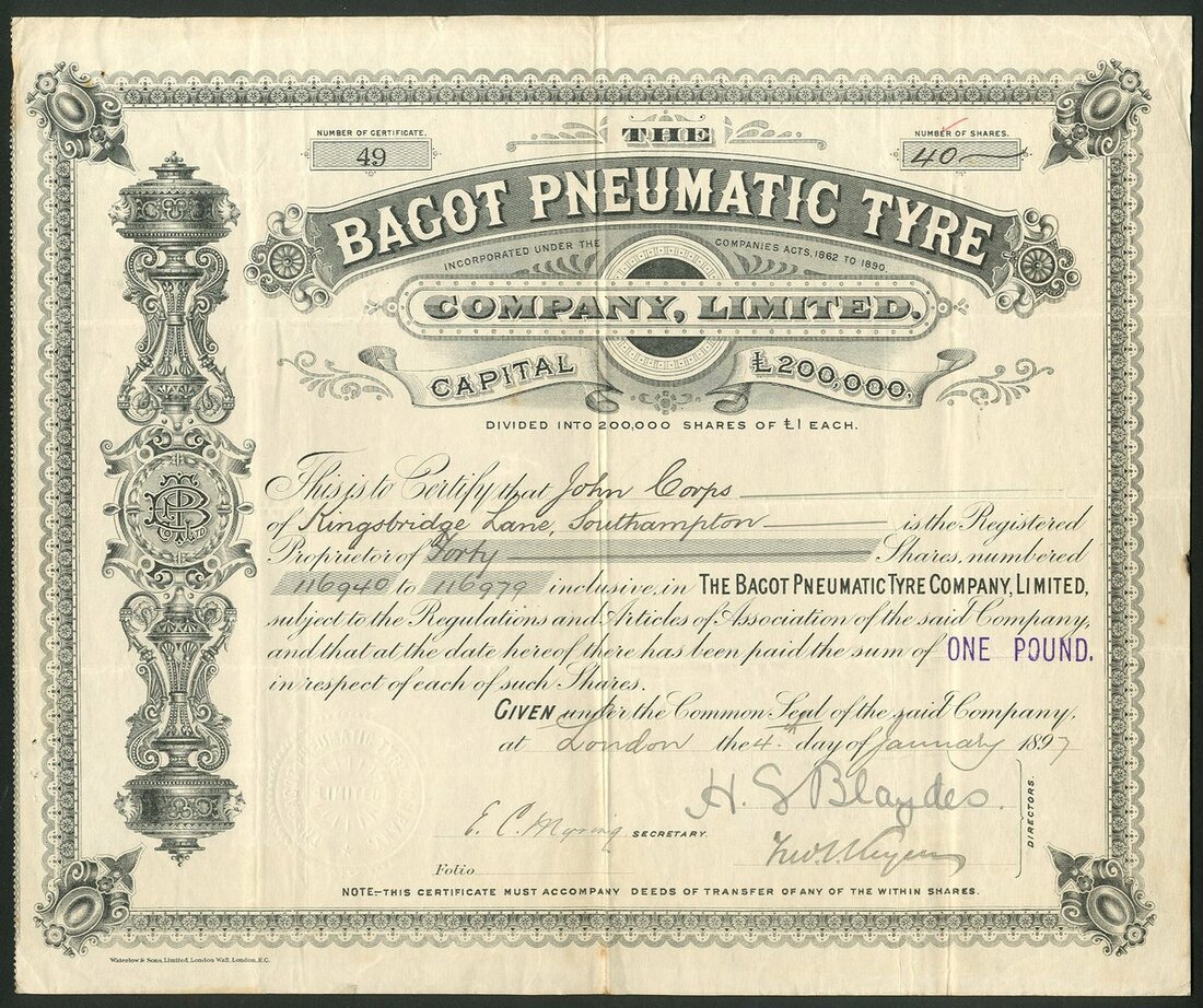 Great Britain: Bagot Pneumatic Tyre Co. Ltd., £1 shares, 189[7], #49, ornate border and scrollwork, black, printed by Waterlow & Sons. The promotor of the Company Mr. Myring created a board of directors of military officers and peers to push the share values which he did with success, bordering on fraud. Sold their patent to the Clipper Pneumatic Tyre Co. A few marks, VF.