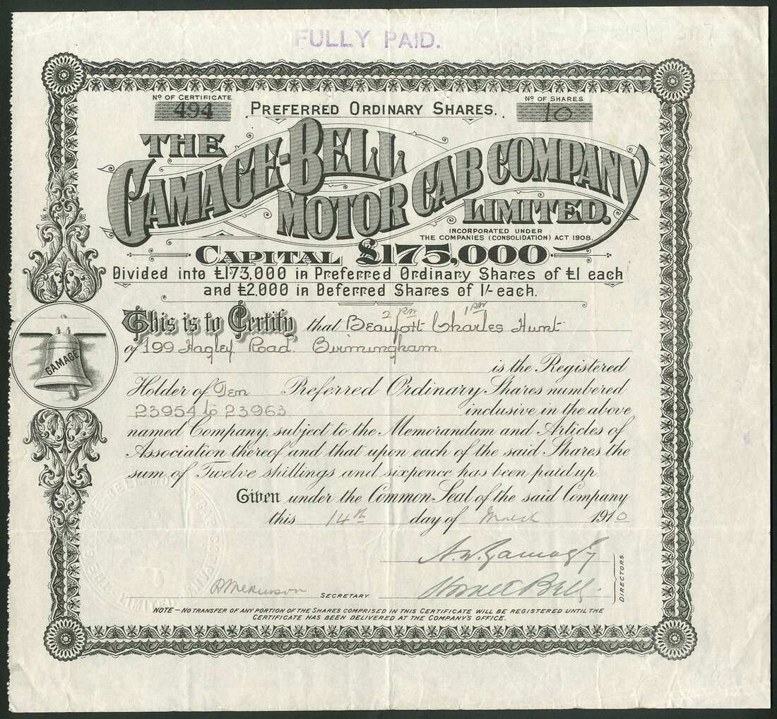 Great Britain: Gamage-Bell Motor Cab Co. Ltd., preferred ordinary shares of 1/- each, 191[0], #494, signed by A.W.Gamage and Horace Bell as directors, vignette of Bell within ornate border, black. Gamage was the well known department store owner in London and also a motoring enthusiast. He sold motor cars in his stores under the 'Gamage' name prior to WW1. Gamages Stores was in business until 1972. Horace Bell was the former manager of the General Motor Cab Company. A few small edge nicks, AVF and scarce.