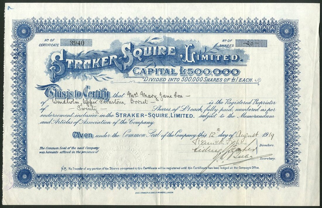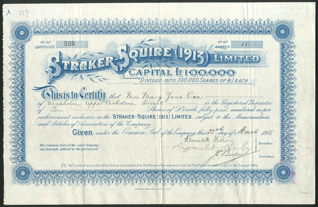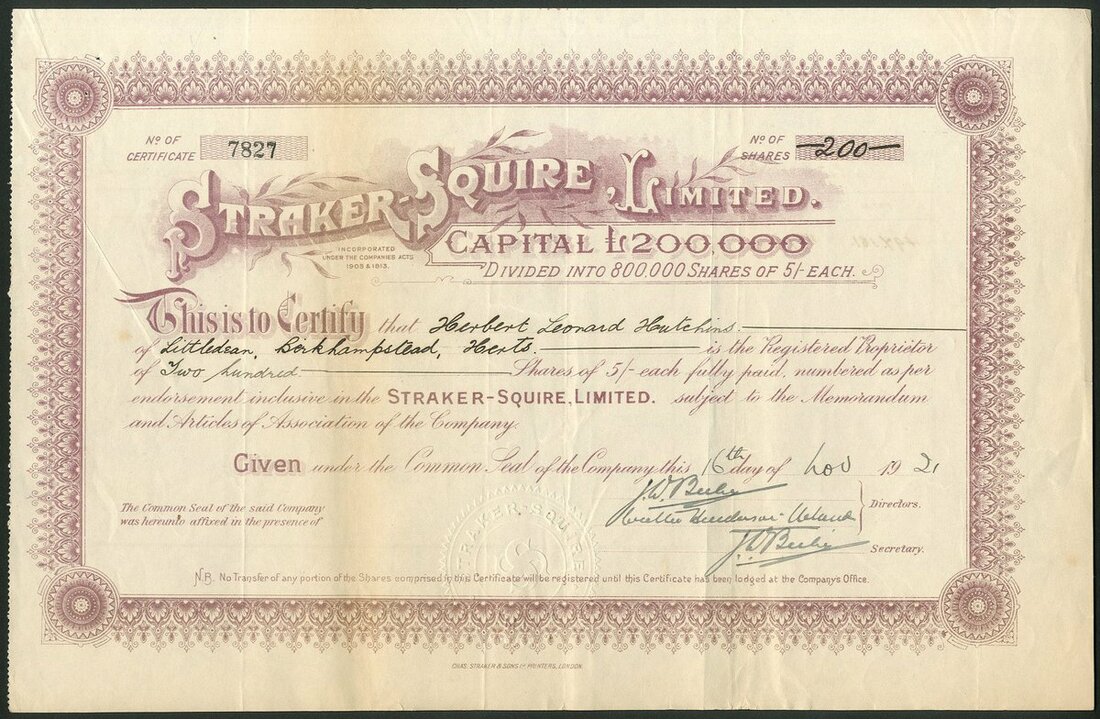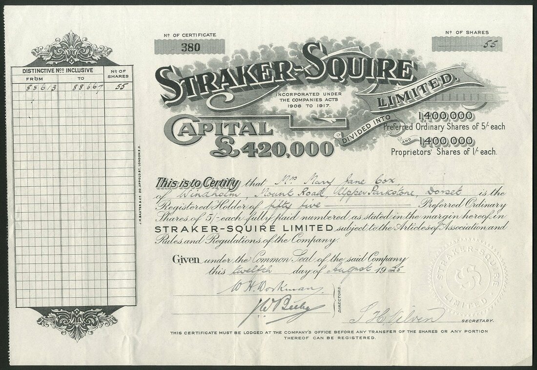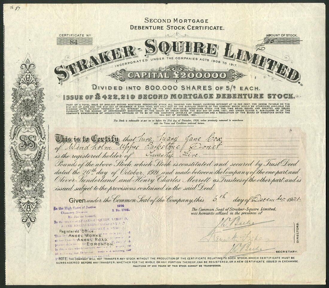 Great Britain: Straker Squire Ltd., a group of certificates comprising £1 shares, 19[15], #559, capital £100,000, blue; £1 shares, 19[19], #3940, capital £500,000, signed by Sidney Straker; 5/- shares, 19[21], #7827, capital £200,000, mauve, 5/- preferred ordinary shares, 19[25], #380, black, and, Second Mortgage Debenture stock, 19[21], #84. Straker started building steam wagons in Bristol, joined with Squire in 1904 and continued to build commercial vehicles and buses but also French cars under licence. Progressed to cars of their own design and continued to prosper until Straker was killed in an accident in 1926. VF (5)