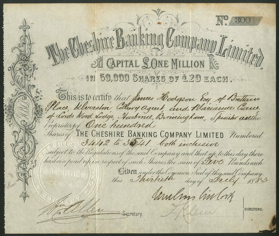 Great Britain: Cheshire Banking Co. Ltd., £20 shares, 18[83], #300, decorative black printing, embossed seal. Formed in 1882, dissolved in 1891. A few stains to edges, AVF.