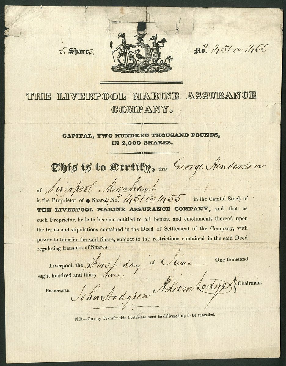 Great Britain: Liverpool Marine Assurance Co., shares of capital stock, 183[3], #1451-1455, black printing with seal at top. Formed in 1830 and wound up in 1851. Numerous tears and hole at top edge, AVF and rare..