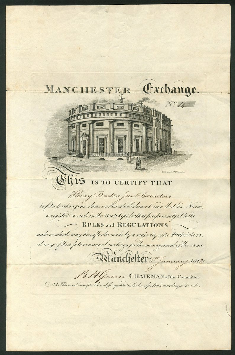 Great Britain: Manchester Exchange, one share, #14, Manchester 18[12], lovely engraved piece with vignette of the exchange building at top, black. This is a new piece to the market of the first type with the vignette different from the better known pieces from the early 1830's. This new Exchange for the cotton industry was designed in 1809 and opened in the same year. It was extended in 1849 but replaced in 1867 by a larger building, with the largest trading hall in the country. VF and only 2 known [R11].