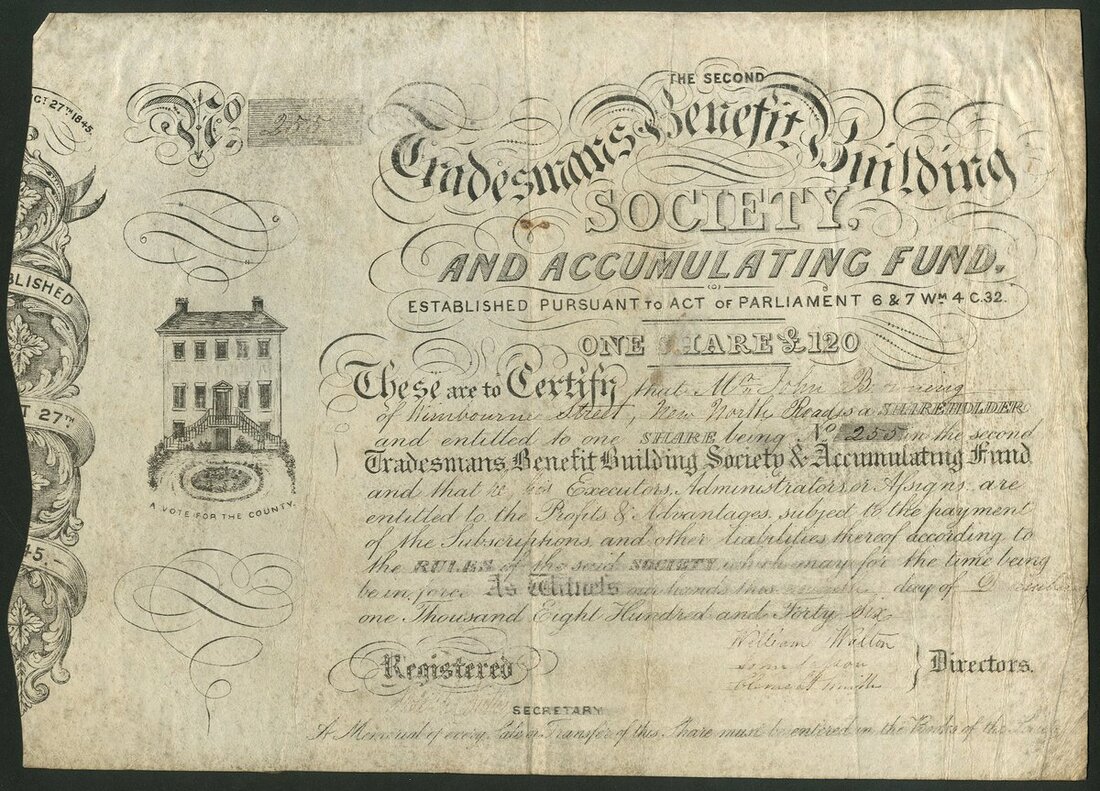 Great Britain: Second Tradesmans Benefit Building Society and Accumulating Fund, £120 share, 184[6], #255, attractive and early piece with building at left, black printing, on vellum, signed by 3 directors. Surface a little grubby, F-VF and rare. First time at auction.