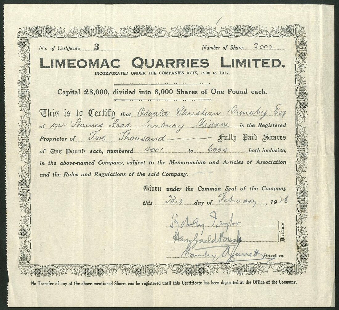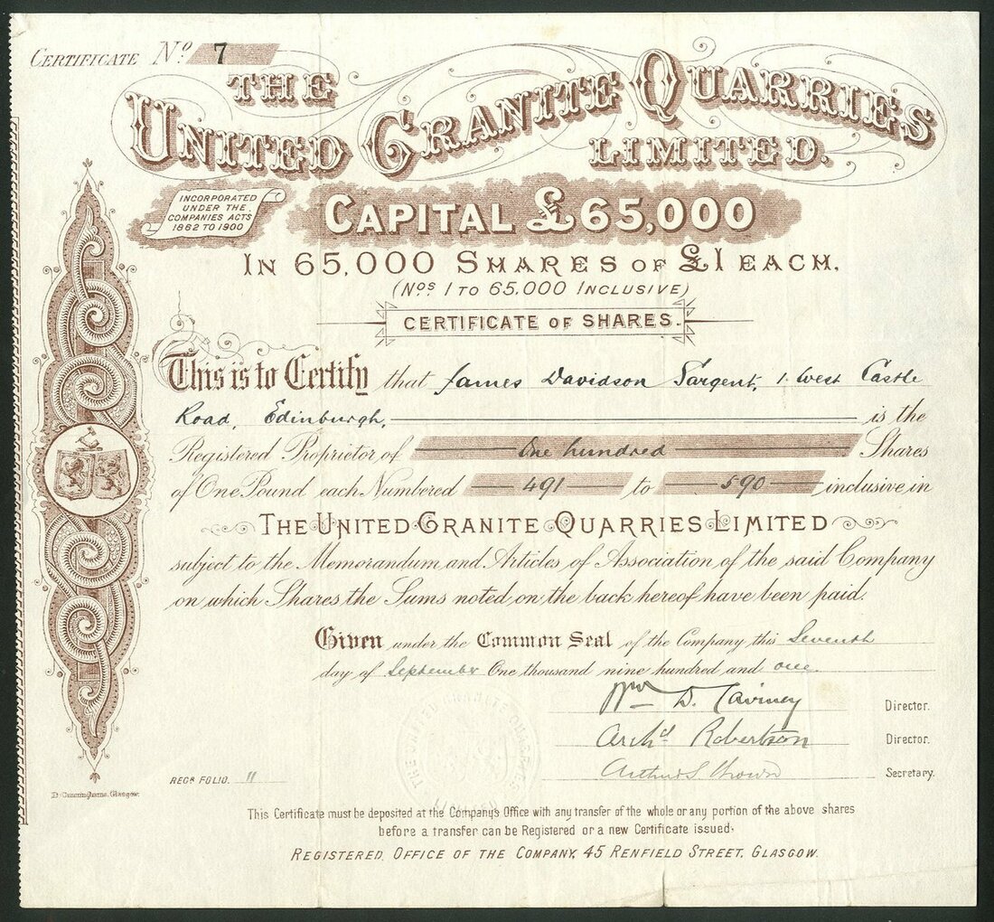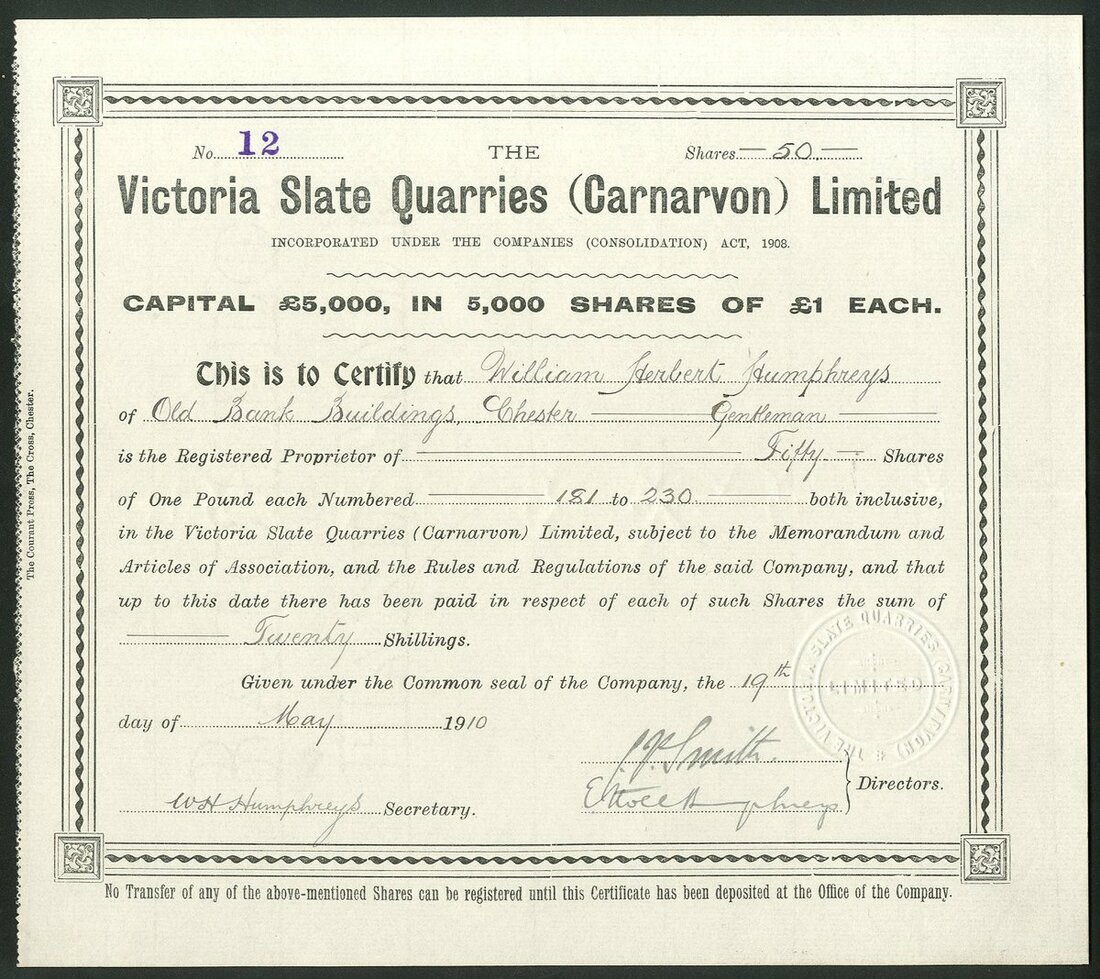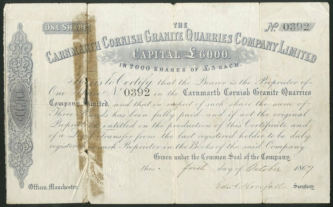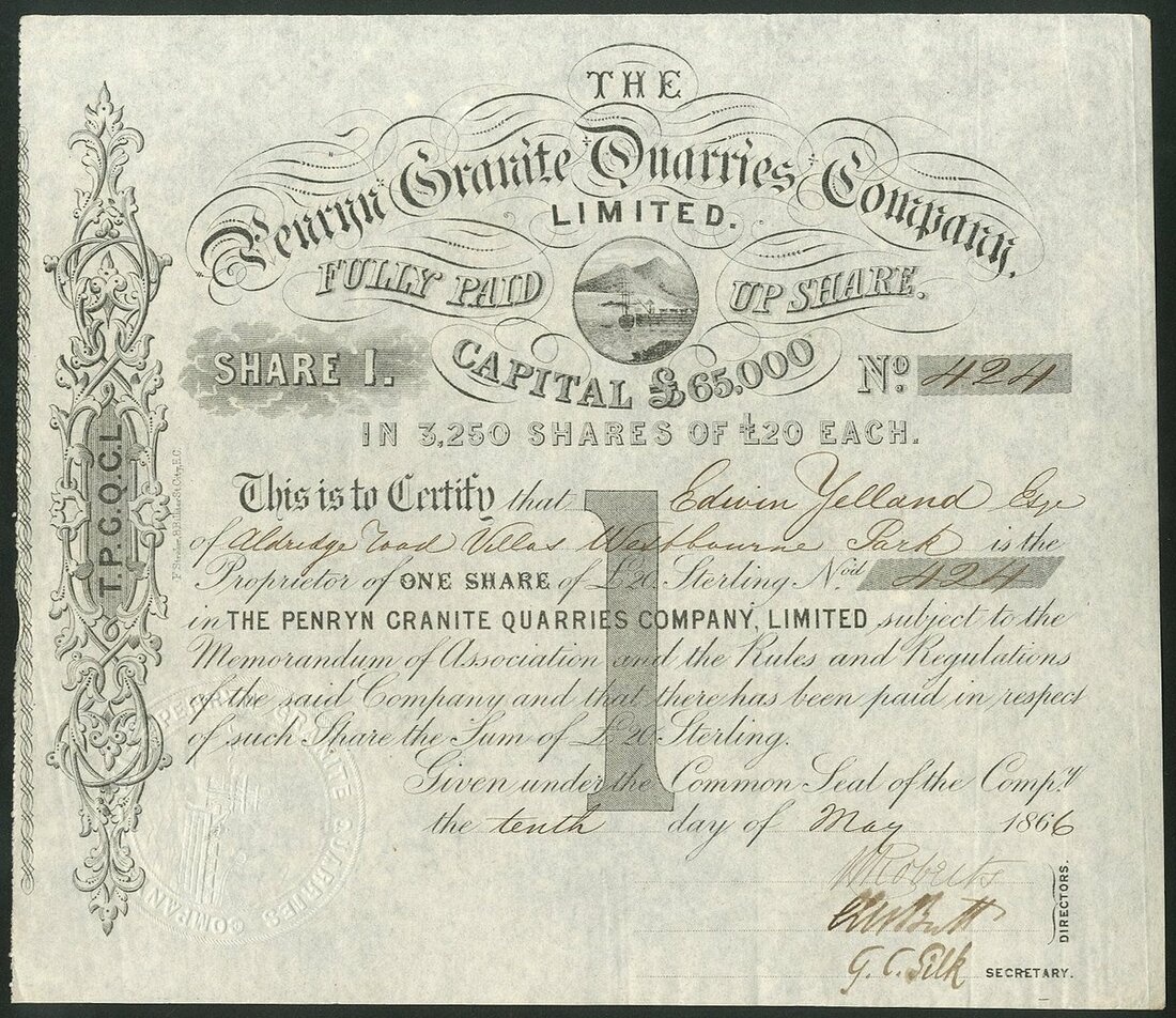 Great Britain: A good collection of stone & slate quarries, comprising Carnmarth Cornish Granite Quarries Co. Ltd., £3 shares, 186[7]; Coxhoe Limestone Co. Ltd., £100 debenture, 19[01]; Craighouse Quarry Co. Ltd., £1 shares, 19[26]; Horse Grove Quarries, 'A' debenture for £25, [1880]; Limeomac Quarries Ltd., £1 shares, 19[26]; London Stone Co. Ltd., £1 shares, 190[2]; National Co-operative Quarries Ltd., £1 shares, 190[7]; North Wales Quarries Ltd., £1 shares, 190[3]; Penryn Granite Quarries Co. Ltd., £20 share, 186[6]; Twenty Well Stone & Brick Co. Ltd., £10 share, 187[1]; United Granite Quarries Ltd., £1 shares, 190[1]; Victoria Slate Quarries (Carnarvon) Ltd., £1 shares, 19[10], and, Worth Quarries Ltd., £1 ordinary shares, 19[25] and £1 preference shares, 19[26]. All but the first VF or better (14).