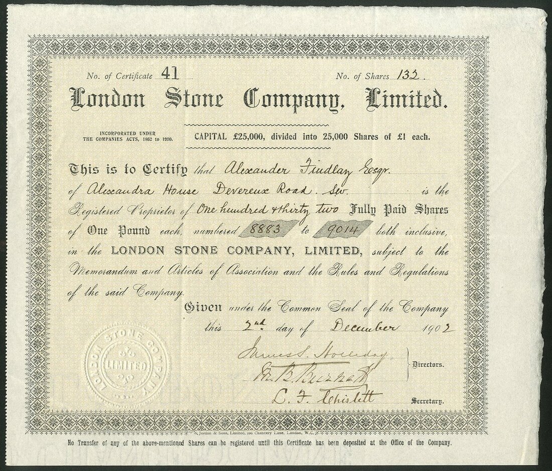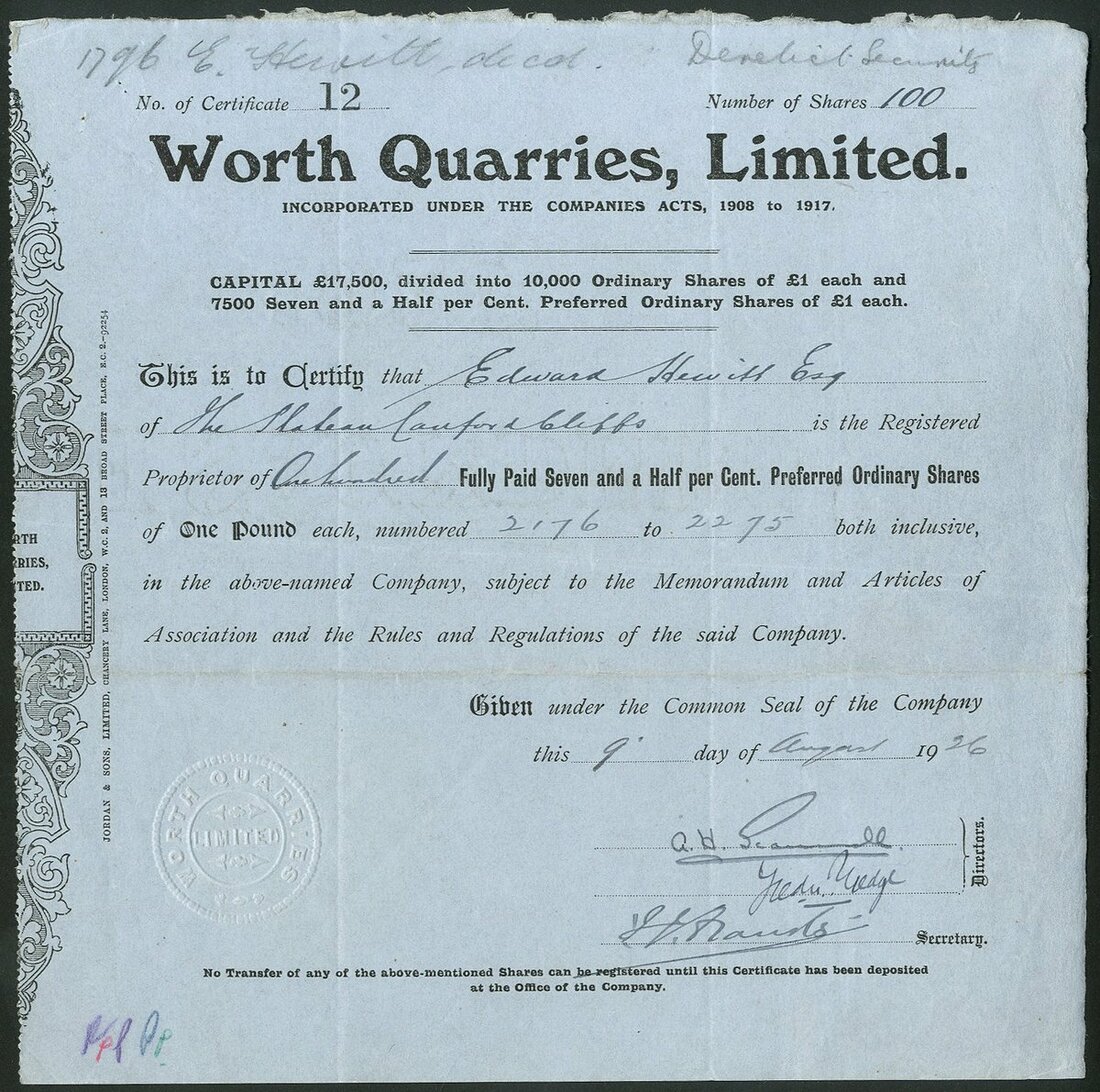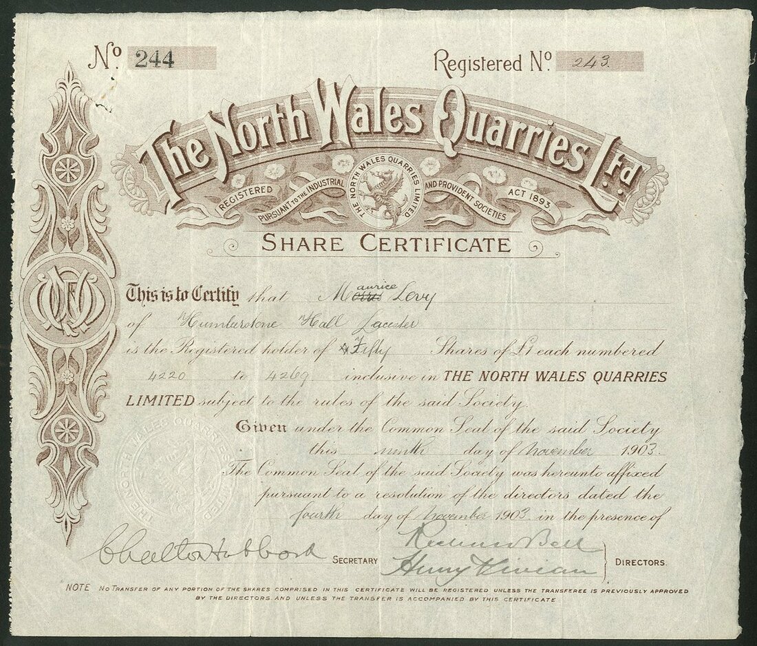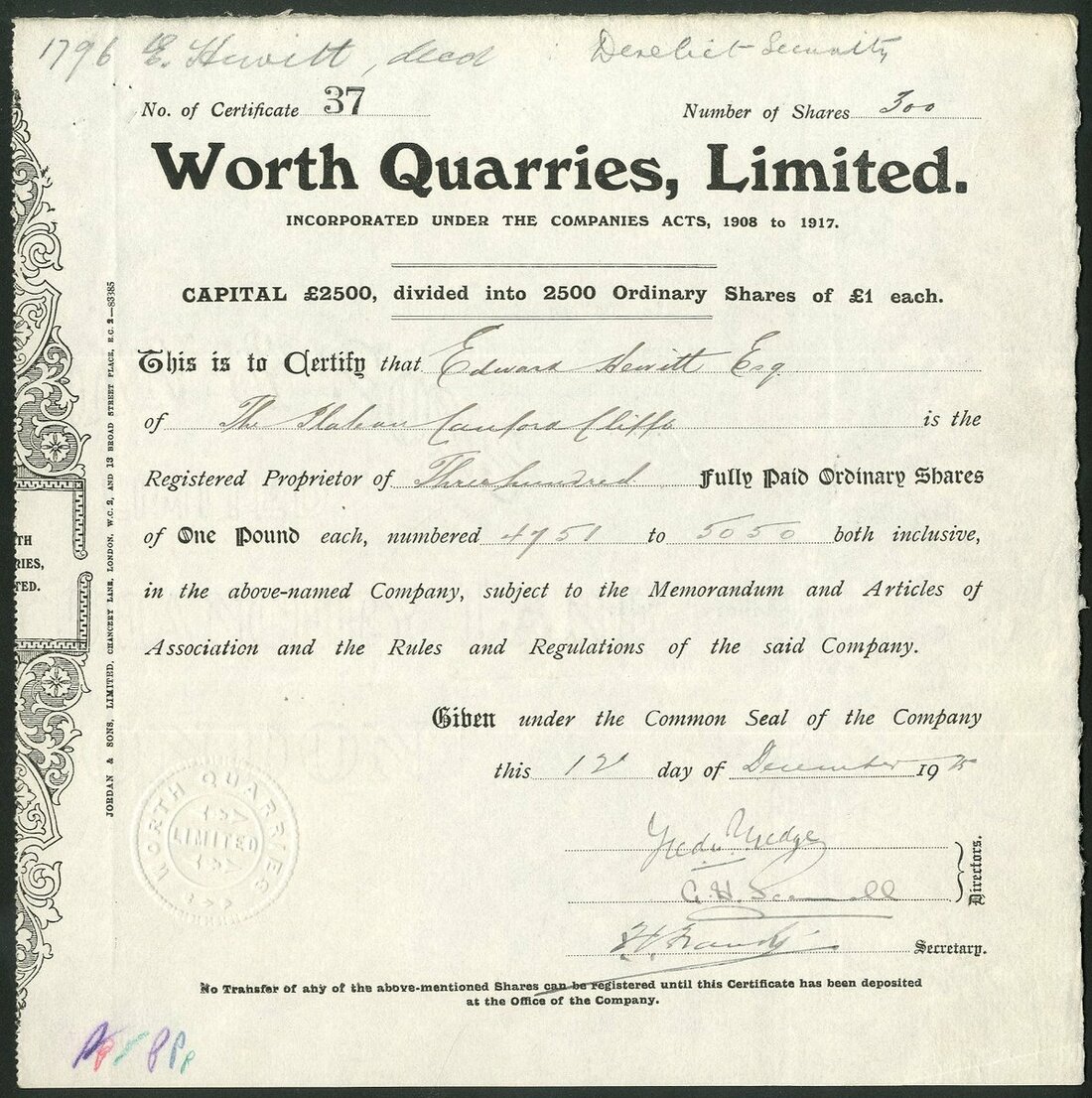 Great Britain: A good collection of stone & slate quarries, comprising Carnmarth Cornish Granite Quarries Co. Ltd., £3 shares, 186[7]; Coxhoe Limestone Co. Ltd., £100 debenture, 19[01]; Craighouse Quarry Co. Ltd., £1 shares, 19[26]; Horse Grove Quarries, 'A' debenture for £25, [1880]; Limeomac Quarries Ltd., £1 shares, 19[26]; London Stone Co. Ltd., £1 shares, 190[2]; National Co-operative Quarries Ltd., £1 shares, 190[7]; North Wales Quarries Ltd., £1 shares, 190[3]; Penryn Granite Quarries Co. Ltd., £20 share, 186[6]; Twenty Well Stone & Brick Co. Ltd., £10 share, 187[1]; United Granite Quarries Ltd., £1 shares, 190[1]; Victoria Slate Quarries (Carnarvon) Ltd., £1 shares, 19[10], and, Worth Quarries Ltd., £1 ordinary shares, 19[25] and £1 preference shares, 19[26]. All but the first VF or better (14).