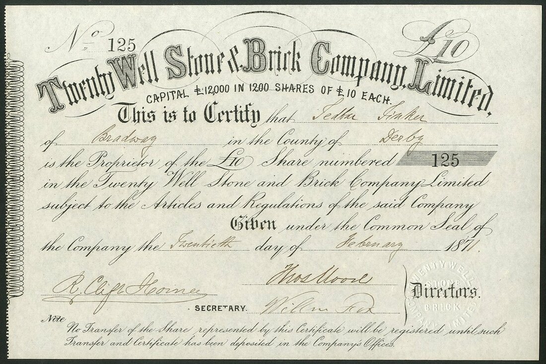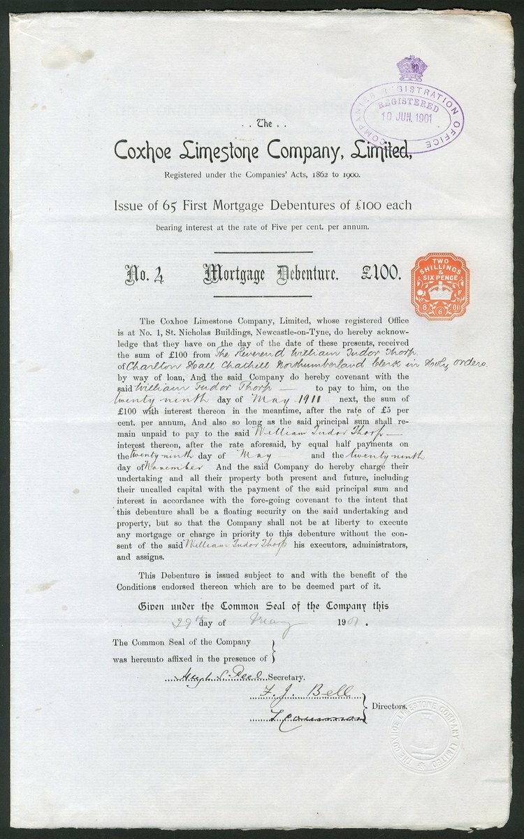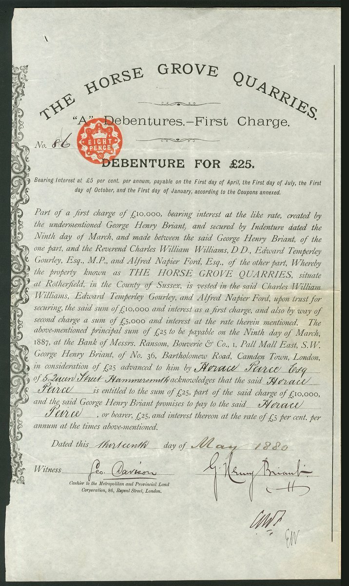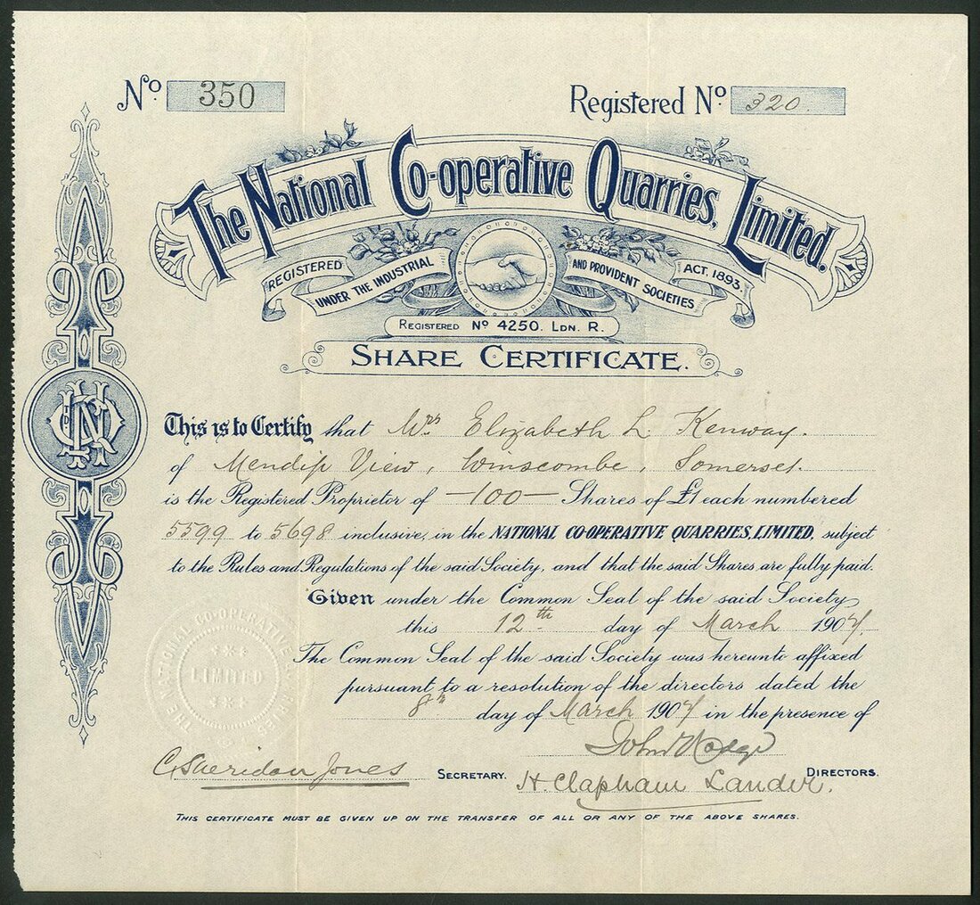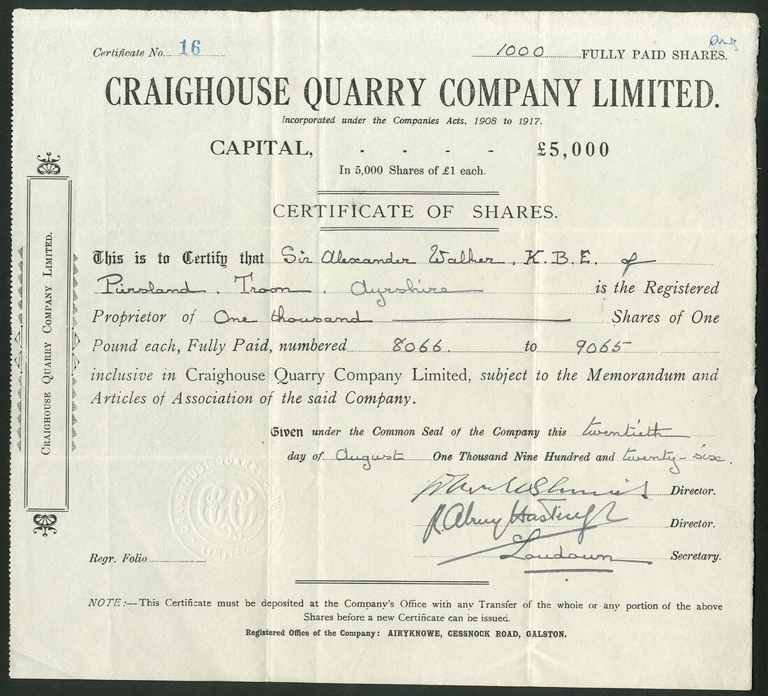 Great Britain: A good collection of stone & slate quarries, comprising Carnmarth Cornish Granite Quarries Co. Ltd., £3 shares, 186[7]; Coxhoe Limestone Co. Ltd., £100 debenture, 19[01]; Craighouse Quarry Co. Ltd., £1 shares, 19[26]; Horse Grove Quarries, 'A' debenture for £25, [1880]; Limeomac Quarries Ltd., £1 shares, 19[26]; London Stone Co. Ltd., £1 shares, 190[2]; National Co-operative Quarries Ltd., £1 shares, 190[7]; North Wales Quarries Ltd., £1 shares, 190[3]; Penryn Granite Quarries Co. Ltd., £20 share, 186[6]; Twenty Well Stone & Brick Co. Ltd., £10 share, 187[1]; United Granite Quarries Ltd., £1 shares, 190[1]; Victoria Slate Quarries (Carnarvon) Ltd., £1 shares, 19[10], and, Worth Quarries Ltd., £1 ordinary shares, 19[25] and £1 preference shares, 19[26]. All but the first VF or better (14).