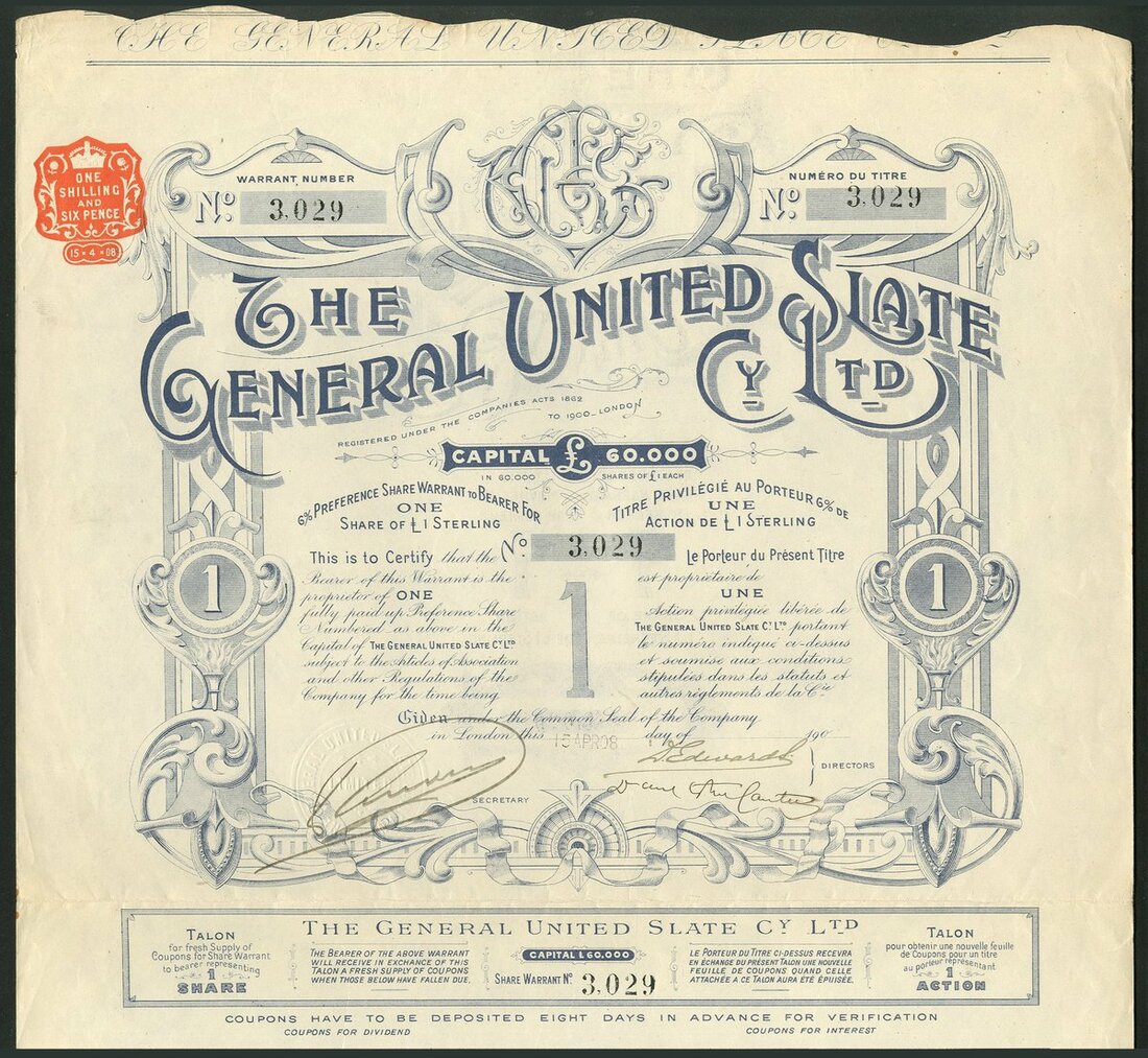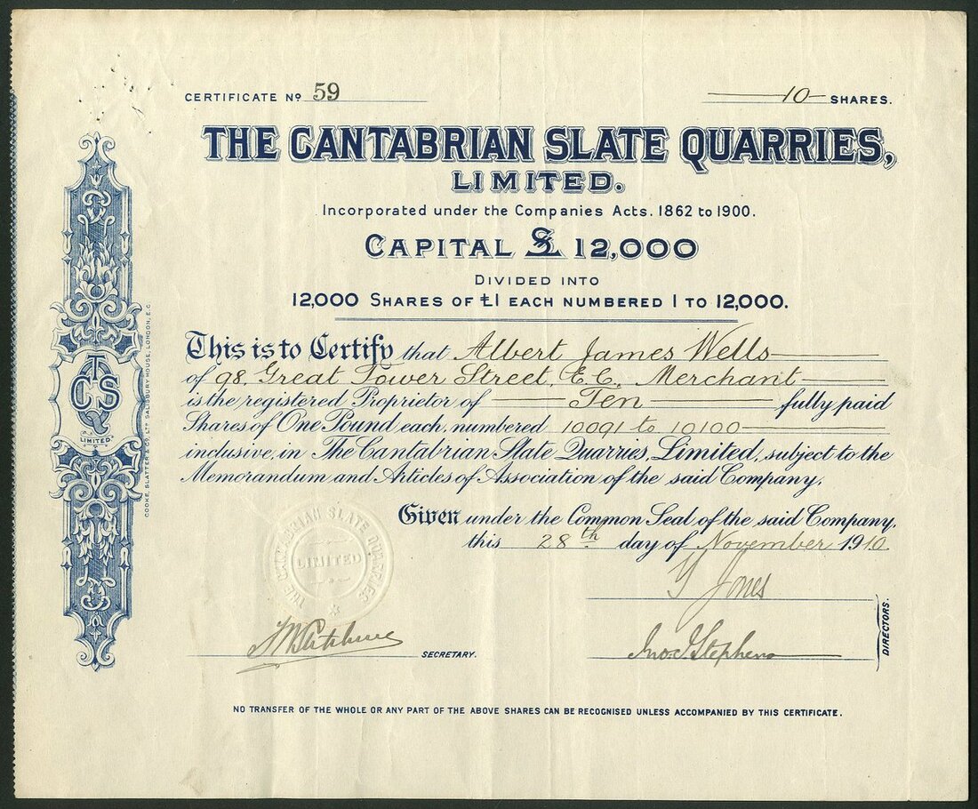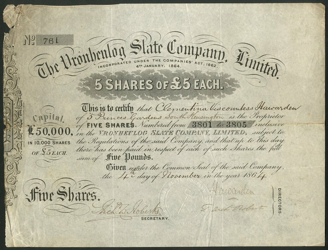 Great Britain: A nice group of Welsh Slate Mining companies comprising; Vronheulog Slate Co. Ltd., 186[4], #761; Tremadoc & Raltwen Slate Co. Ltd., 18[65], #135; Rhosydd Slate Co. Ltd., 18[65], #4896; Hendre-Ddu Slate and Slab Quarry Co. Ltd., 186[1], #1247; General United Slate Co. Ltd., 190[8], #3029; Carreg Fawr Slate and Mineral Co. Ltd., 1861, #936, and Cantabrian Slate Quarries Ltd., 19[10]. The first with damaged left edge, second with foxing and tear on fold, others generally AVF. (7)