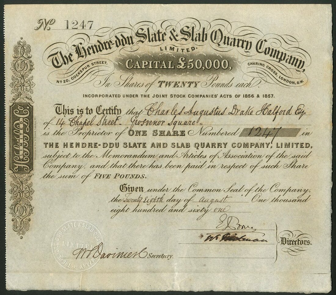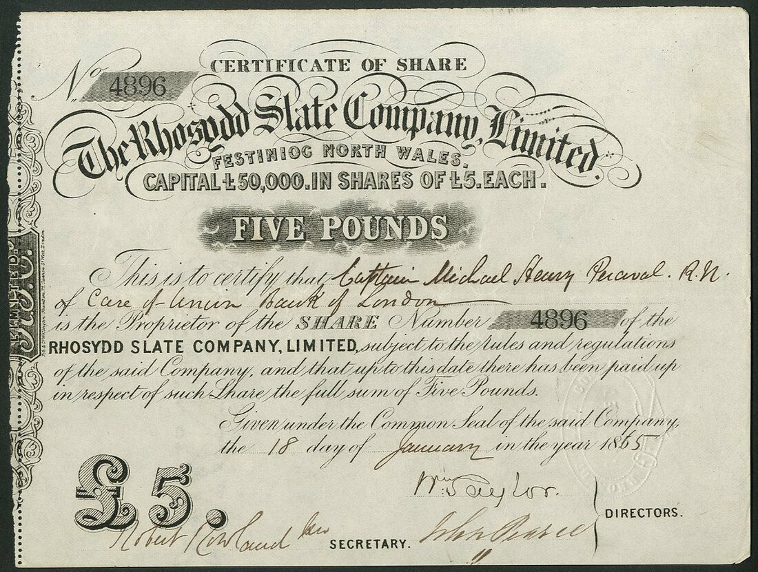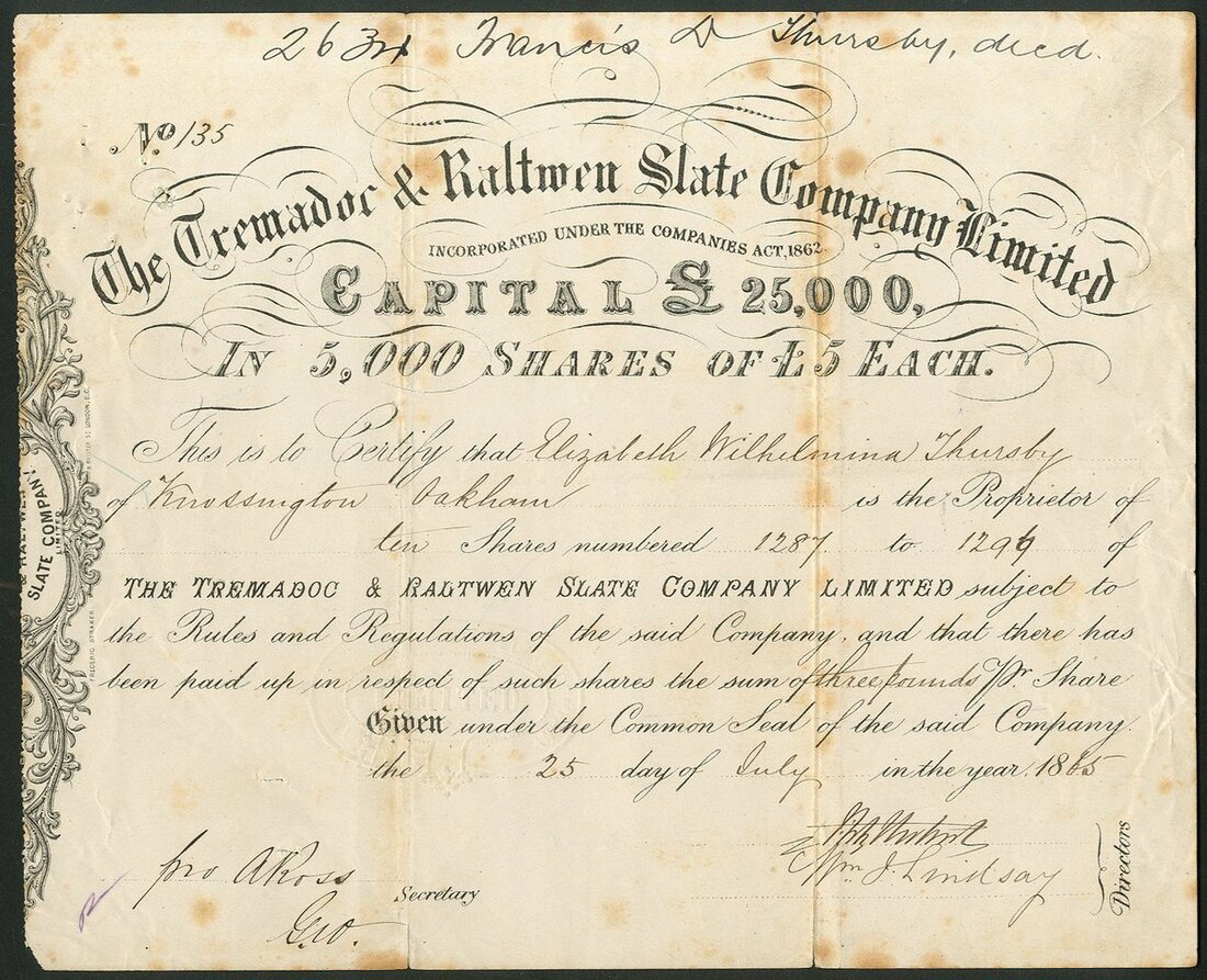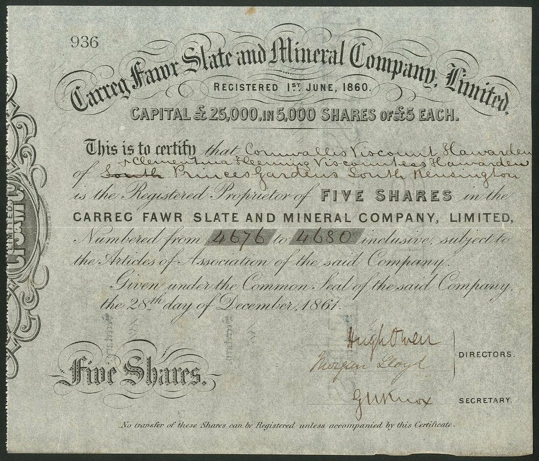 Great Britain: A nice group of Welsh Slate Mining companies comprising; Vronheulog Slate Co. Ltd., 186[4], #761; Tremadoc & Raltwen Slate Co. Ltd., 18[65], #135; Rhosydd Slate Co. Ltd., 18[65], #4896; Hendre-Ddu Slate and Slab Quarry Co. Ltd., 186[1], #1247; General United Slate Co. Ltd., 190[8], #3029; Carreg Fawr Slate and Mineral Co. Ltd., 1861, #936, and Cantabrian Slate Quarries Ltd., 19[10]. The first with damaged left edge, second with foxing and tear on fold, others generally AVF. (7)
