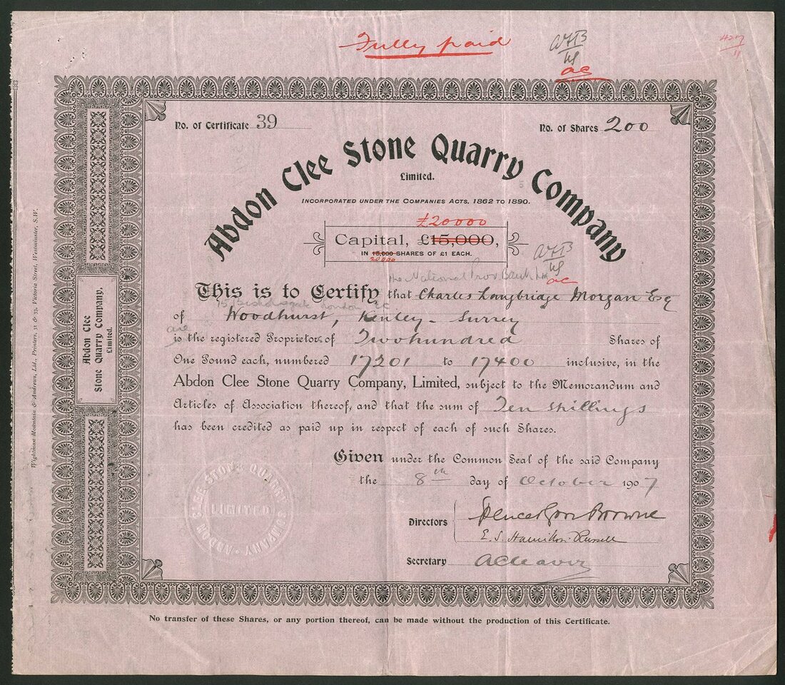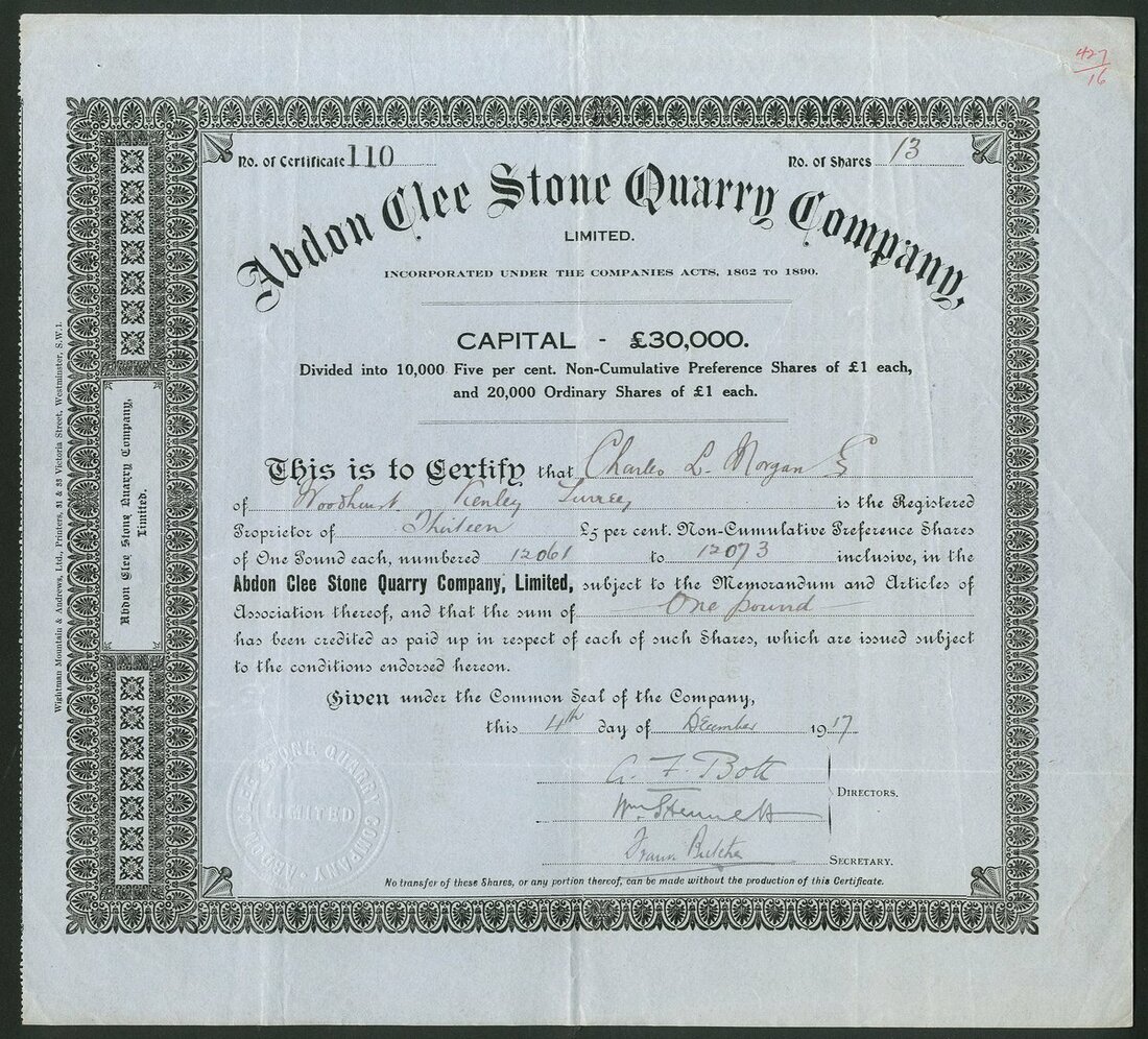 Great Britain: Abdon Clee Stone Quarry Co. Ltd., preference shares of £1 each, 19[17], #110, and ordinary £1 shares, 190[7], #39, both with ornate border, the latter on pink paper. Owned quarries in the Clee Hills, Shropshire. AVF. (2)