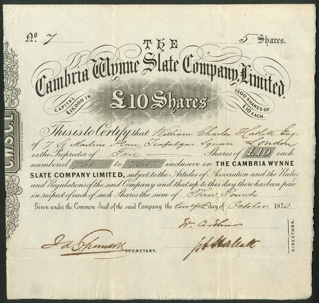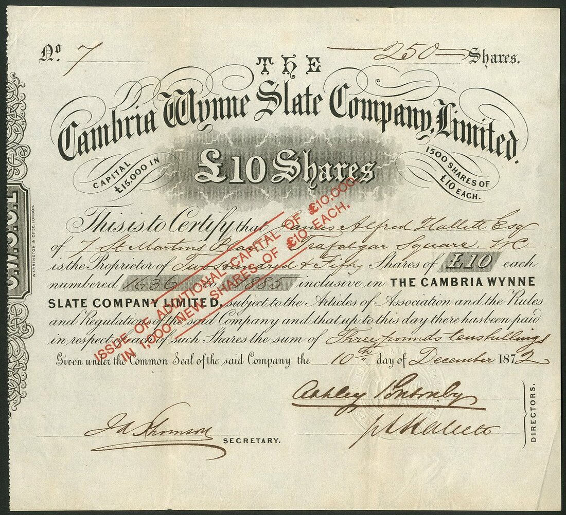 Great Britain: Cambria Wynne Slate Co. Ltd., pair of certificates for £10 shares, 187[0] and 187[2], the latter overprinted with additional capital and share issue, both #7, black. Quarries near Maehynlleth, Montgomeryshire. VF. (2)