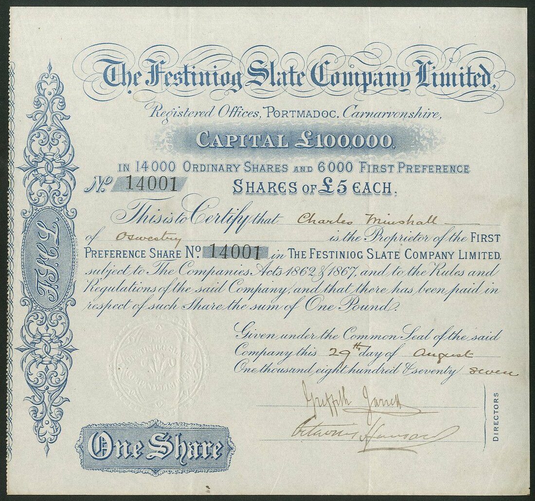Great Britain: Festiniog Slate Co. Ltd., one £5 preference share, 187[7], #14001, blue. We sold the ordinary share certificate in our last sale. This one is the first time at auction. GVF.