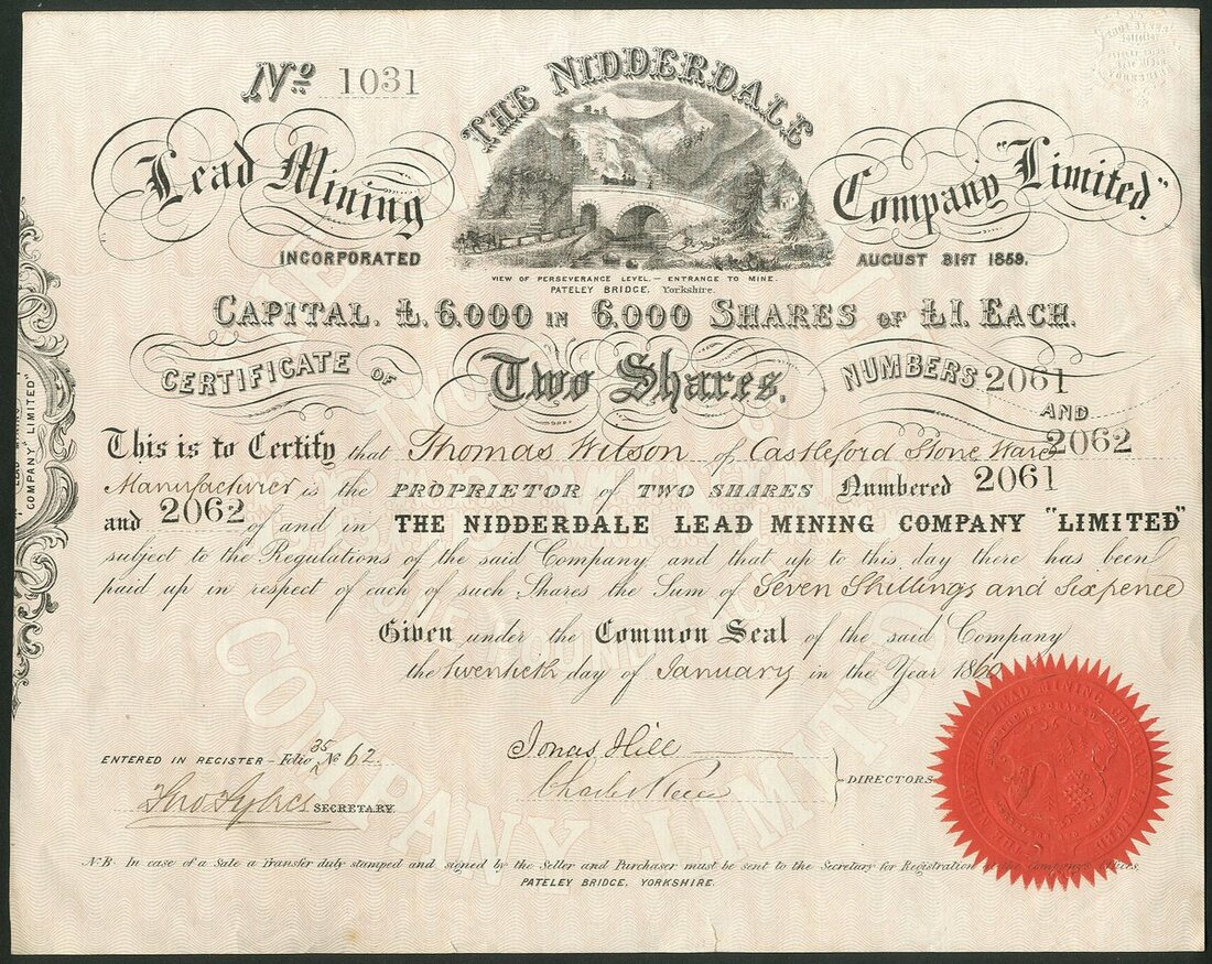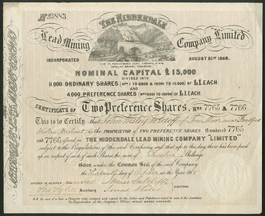 Great Britain: Nidderdale Lead Mining Co. Ltd., pair of certificates for 2 shares, 18[60], #1031, and 2 preference shares, 186[5], #3883, of similar design with vignette of bridge and mine entrance, black, pink underprint. Mines at Pateley Bridge, Yorkshire. The second has a split seal otherwise both VF (2).